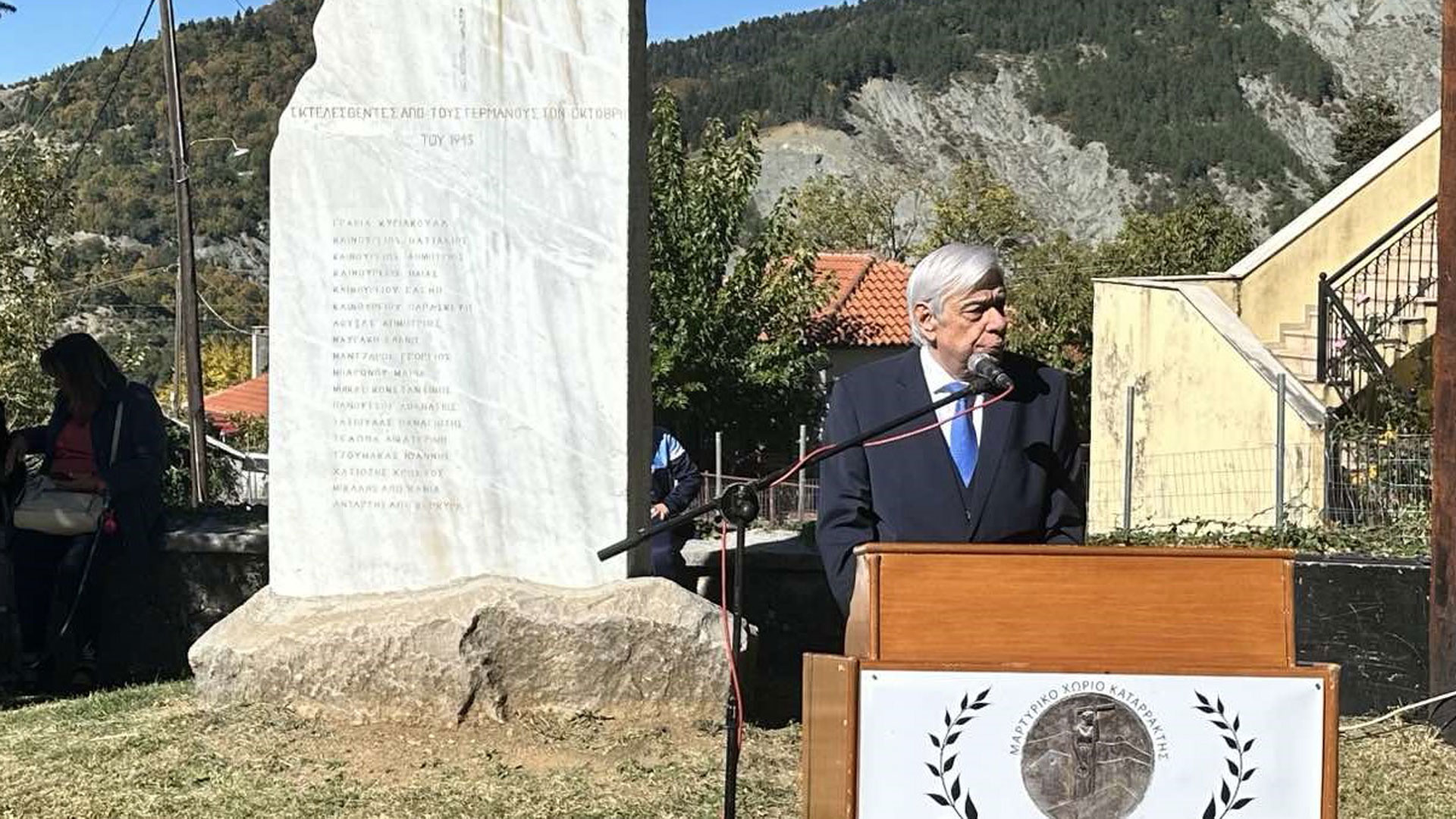 Η μνήμη μου γυρίζει πίσω, στην 2α Νοεμβρίου 2019, όταν ως Πρόεδρος της Δημοκρατίας βρέθηκα για πρώτη φορά μαζί σας προκειμένου ν’ αποτίσουμε τον οφειλόμενο φόρο τιμής στην Ιερή Μνήμη των τραγικών Θυμάτων της θηριωδίας, η οποία συντελέσθηκε εδώ, στην ευρύτερη περιοχή του Καταρράκτη Αρτας, τον Οκτώβριο του 1943. Διευκρινίζω με ειλικρινή συγκίνηση ότι η τιμή που τότε μου περιποιήσατε, όταν με ανακηρύξατε Επίτιμο Δημότη του Δήμου Κεντρικών Τζουμέρκων, έχει πλέον μετατραπεί σε χρέος μου το οποίο θα εκπληρώνω εφ’ όρου ζωής. Επανέρχομαι δε, κατ’ ανάγκη και σε γενικές γραμμές, στα όσα είχα την εποχή εκείνη τονίσει ενώπιόν σας. Υπογραμμίζω κατ’ αρχάς, και πάλι, το γεγονός ότι η Πολιτεία, με την αναγνώριση-καταδίκη της ναζιστικής θηριωδίας στον Καταρράκτη και με την συνακόλουθη ένταξή του στον κατάλογο των Μαρτυρικών Χωριών, με σχετικό Προεδρικό Διάταγμα (ΦΕΚ Α/79/1-06-2017), εξεπλήρωσε ένα στοιχειώδες Χρέος Τιμής όχι μόνον απέναντι στα τραγικά Θύματα και στις Οικογένειές τους, αλλά και απέναντι στην ίδια την Ιστορία του Τόπου μας. Διότι η διατήρηση της Ιστορικής Μνήμης αποτελεί, και δη κυριολεκτικώς, όρο επιβίωσης του Εθνους μας.