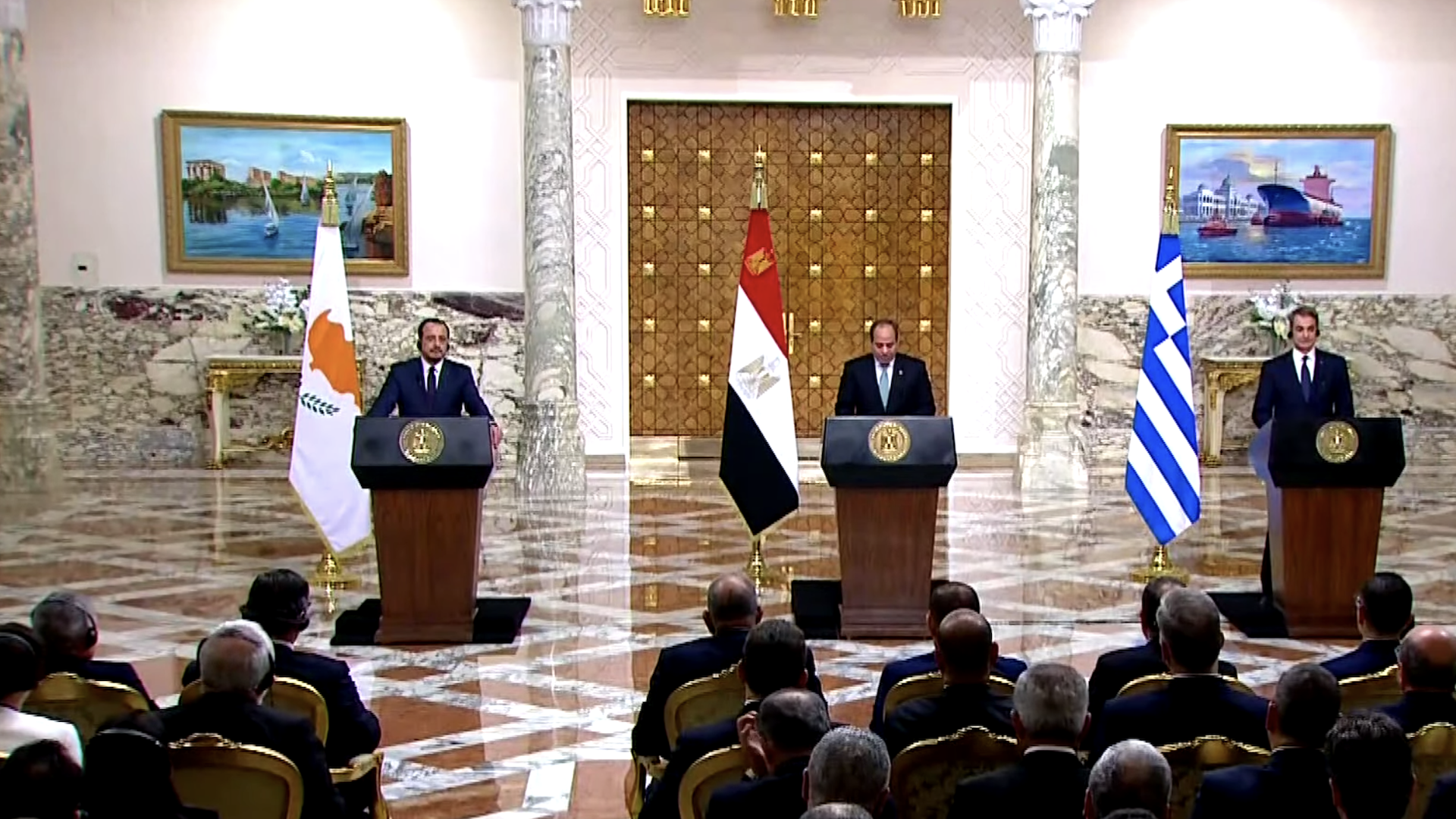 Στο πλαίσιο της συνέντευξης Τύπου που παραχώρησαν έπειτα από την ολοκλήρωση της 10ης Τριμερούς Συνόδου Κορυφής Ελλάδας-Κύπρου-Αιγύπτου που πραγματοποιήθηκε σήμερα στο Κάιρο, οι ηγέτες των τριών χωρών έστειλαν το δικό τους -κοινό- μήνυμα υπέρ του σεβασμού του διεθνούς δικαίου, της αποκατάστασης της σταθερότητας στην ευρύτερη γειτονιά τους, αλλά και της απαλλαγής από επεμβάσεις/παρεμβάσεις εξωτερικών παραγόντων σε άλλα κράτη.