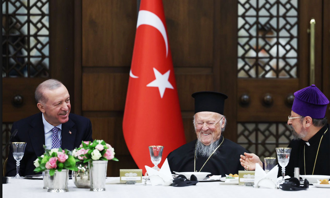 Ιφτάρ προς τους θρησκευτικούς ηγέτες παρέθεσε χθες ο Ταγίπ Ερντογάν, με τον φωτογραφικό φακό να «συλλαμβάνει» τον Οικουμενικό Πατριάρχη Βαρθολομαίο δίπλα δίπλα με τον Τούρκο πρόεδρο. Ο διάλογος, όπως φάνηκε, ήταν εγκάρδιος, με τις πληροφορίες να λένε πως συζητήθηκαν θέματα που αφορούν το Φανάρι και την ομογένεια και με τον Τούρκο πρόεδρο να δείχνει το ενδιαφέρον του. Μεταξύ των καλεσμένων στο γεύμα ήταν ακόμη ο πρόεδρος της Σομαλίας, ο υπουργός Αμυνας της Τουρκίας αλλά και ο διοικητής των τουρκικών μυστικών υπηρεσιών ΜΙΤ, Ιμπραήμ Καλίν.