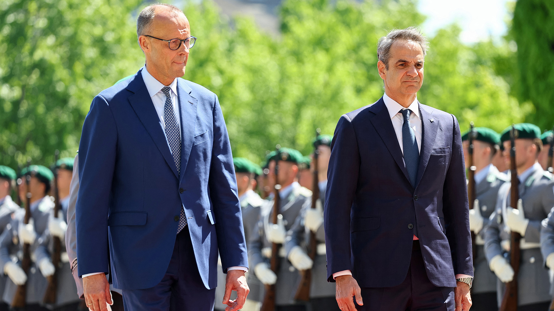 Ο κ. Μητσοτάκης έγινε δεκτός με στρατιωτικές τιμές, ενώ είναι ο πρώτος ηγέτης που υποδέχεται ο νέος καγκελάριος από την ανάληψη των καθηκόντων του.