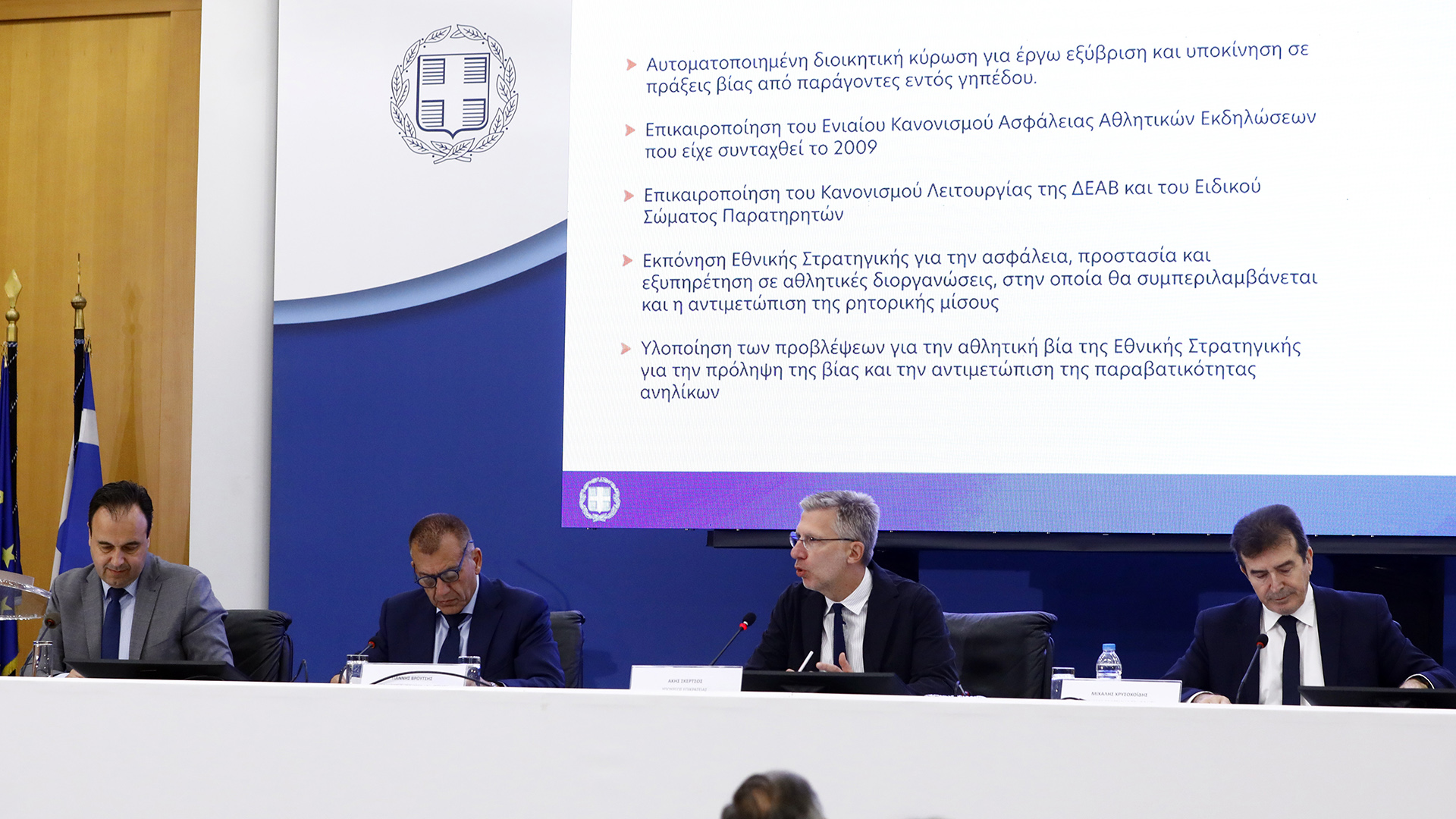 - Εκπόνηση Εθνικής Στρατηγικής για την ασφάλεια, προστασία και εξυπηρέτηση σε αθλητικές διοργανώσεις, στην οποία θα συμπεριλαμβάνεται και η αντιμετώπιση της ρητορικής μίσους.
