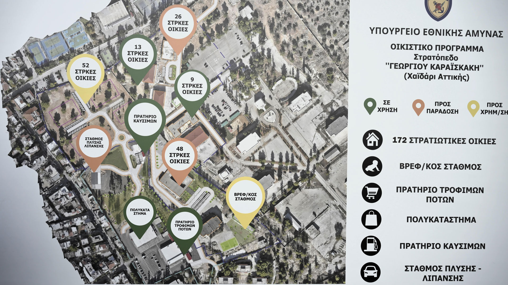 - Στρατόπεδο Καραΐσκάκη στο Χαϊδάρι Αττικής: Έκταση 145 στρεμμάτων περίπου (2 ή 3 γεωτεμάχια), κατασκευή 58 συγκροτημάτων των 12 διαμερισμάτων, δηλαδή συνολικά 696 διαμερίσματα.