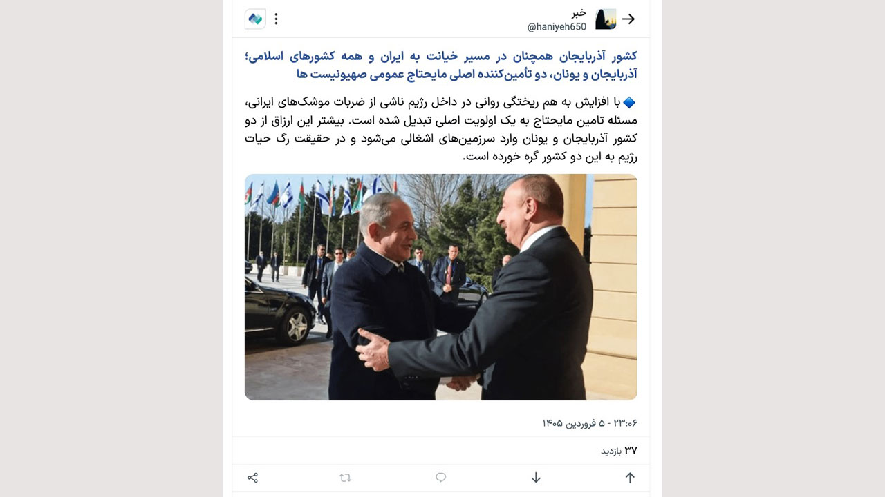 Η ανάρτηση στο Fars έχει ως εξής: «Η χώρα Αζερμπαϊτζάν συνεχίζει στον δρόμο της προδοσίας προς το Ιράν και σε όλες τις μουσουλμανικές χώρες· το Αζερμπαϊτζάν και η Ελλάδα, οι δύο κύριες προμηθεύτριες των γενικών αναγκών των σιωνιστών. Με την αύξηση της ψυχολογικής αναστάτωσης εντός του καθεστώτος (σ.σ. κυβέρνηση του Ισραήλ) λόγω των χτυπημάτων των ιρανικών πυραύλων, το ζήτημα της προμήθειας αγαθών έχει γίνει κυρίαρχη προτεραιότητα. Τα περισσότερα από αυτά τα αγαθά εισάγονται από τις δύο χώρες, το Αζερμπαϊτζάν και την Ελλάδα, στα κατεχόμενα εδάφη (σ.σ. το Ισραήλ) και στην πραγματικότητα αποτελούν τον ζωτικό αγωγό του καθεστώτος». Υπενθυμίζεται ότι όντως το Αζερμπαϊτζάν αποτελεί σημείο εισόδου ρωσικού αργού που καταλήγει στο Ισραήλ, μέσω του αγωγού από το Μπακού έως το τουρκικό λιμάνι του Τσεϊχάν στην Ανατολική Μεσόγειο.