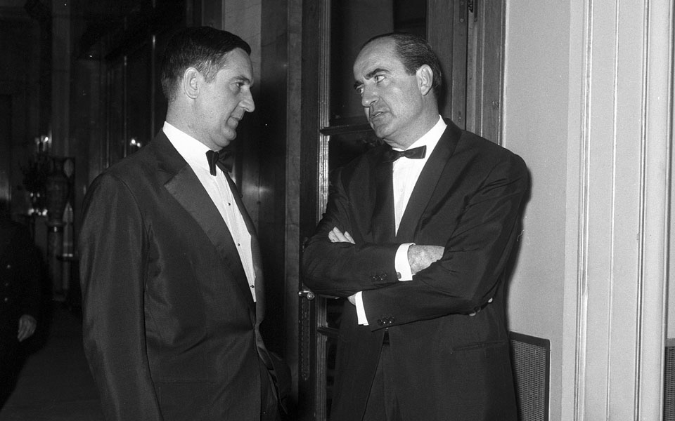 Ο Κωνσταντίνος Μητσοτάκης σε δεξίωση στο ξενοδοχείο «Μεγάλη Βρεταννία» με τον διπλωμάτη Τζώνυ Σωσσίδη, ο οποίος διαδραμάτισε κρίσιμο ρόλο στα γεγονότα του 1965.