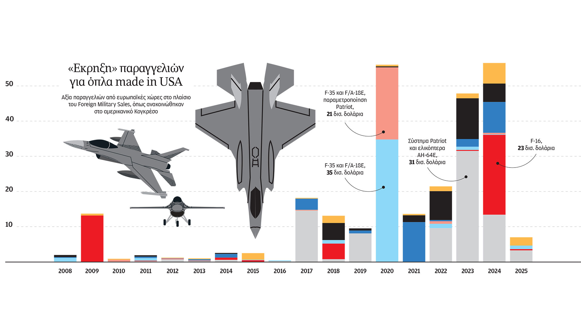 Η Ευρώπη μετεξελίσσεται από παραδοσιακό σύμμαχο στον καλύτερο πελάτη των ΗΠΑ, όπως καταδεικνύει και η εξέλιξη των μεταξύ τους συναλλαγών. Ειδικότερα, οι δαπάνες της Ευρώπης για την αγορά αμερικανικών εξοπλισμών αυξήθηκαν από 32 δισ. δολάρια την περίοδο 2008-2013, σε 185 δισ. το διάστημα 2014-2021 και 190 δισ. την περίοδο 2022-2025 (από τα συνολικά 383 δισ. του αμερικανικού προγράμματος πωλήσεων για την ίδια τετραετία). Αθροιστικά, από το 2008 έως το 2025 η Ευρώπη έχει καταβάλει στις ΗΠΑ για αγορές αμυντικών εξοπλισμών 407 δισ. δολάρια. Οι συνολικές πωλήσεις των ΗΠΑ σε όλο τον κόσμο, την ίδια περίοδο, ανήλθαν σε 1,4 τρισ. δολάρια.