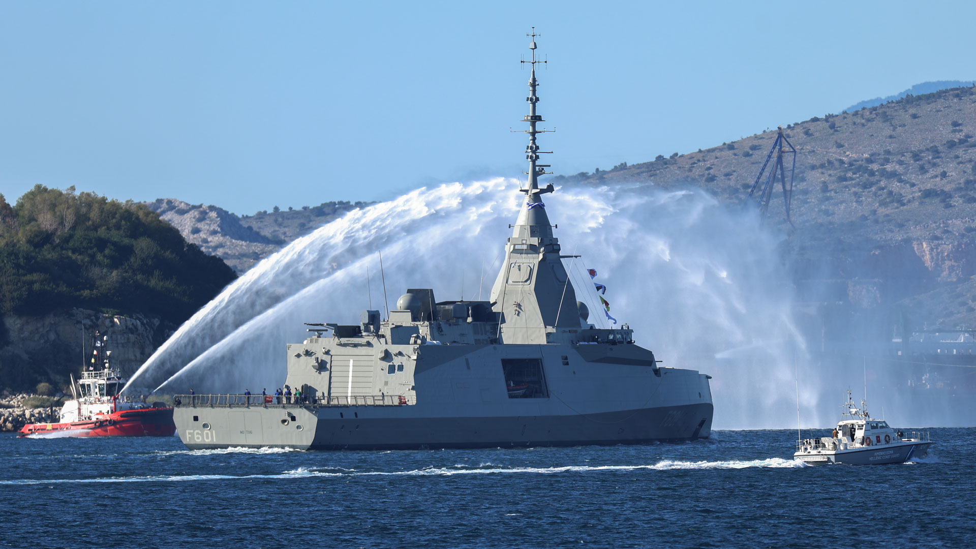 Τη σύγχρονη φρεγάτα, την οποία ο υπουργός Εθνικής Αμυνας, Νίκος Δένδιας, χαρακτήρισε την «πιο ισχυρή στον πλανήτη», υποδέχθηκαν σε σχηματισμό 8 μονάδες του Π.Ν. Παράλληλα, από αέρος, συμμετείχαν στην τελετή τρία ελικόπτερα Aegean Hawk του Πολεμικού Ναυτικού.