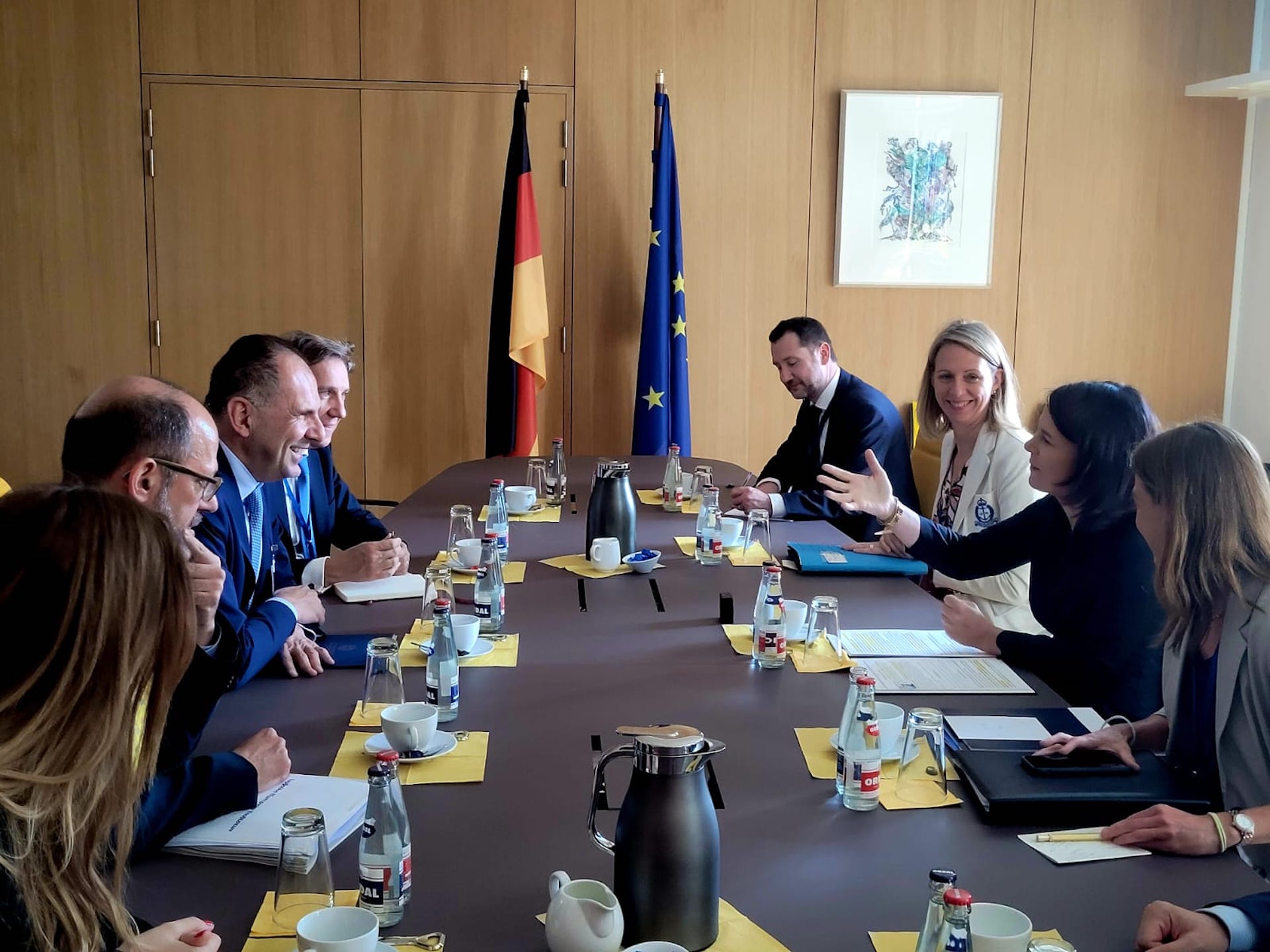 Κατά τη διάρκεια της συνάντησης, οι ΥΠΕΞ Ελλάδας και Γερμανίας είχαν γόνιμη συζήτηση για την πολιτική συνεργασία των δύο χωρών, το μεταναστευτικό, τις εξελίξεις στην Ανατολική Μεσόγειο, τη συνεργασία σε θέματα κλιματικής αλλαγής και τη διάσκεψη «Our Ocean Conference 2024» που θα πραγματοποιηθεί στην Ελλάδα, όπως σημειώνει σε σχετική ανάρτησή του στο Twitter το ελληνικό ΥΠΕΞ. Ο κ. Γεραπετρίτης και η κα. Μπέρμποκ αντάλλαξαν, επίσης, προσκλήσεις για τον προγραμματισμό εκατέρωθεν επισκέψεων.