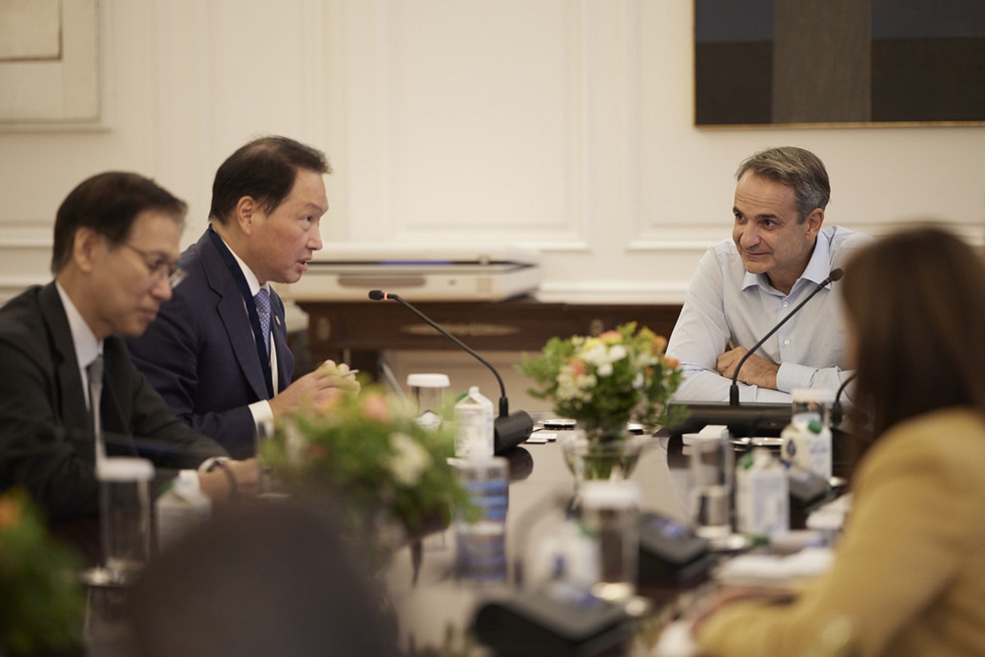 Η κορεάτικη αντιπροσωπεία αποτελούνταν από τον πρόεδρο του Εμπορικού και Βιομηχανικού Επιμελητηρίου της Κορέας και πρόεδρο του SK Group, Chey Taewon, τον εκτελεστικό αντιπρόεδρο για την Καινοτομία του SK Group, Yoosuk Kim, τον αντιπρόεδρο και διευθύνοντα σύμβουλο της Hyundai Heavy Industries, Ka Sam Hyun, τον πρόεδρο των Hanwha Aerospace και Hanwha Foundation of Culture, Shin Hyun Woo, τον αντιπρόεδρο της Hyundai Motor Europe, Kim Yong Jin, τον αντιπρόεδρο του Εμπορικού και Βιομηχανικού Επιμελητηρίου Κορέας, Lee Seong Woo και τον αντιπρόεδρο και γενικό διευθυντή Επιχειρήσεων της Export-Import Bank of Korea, Kwon Woo Seog. Στη σύσκεψη έλαβε μέρος επίσης ο πρέσβης της Δημοκρατίας της Κορέας στην Ελλάδα, Lee Jung Il.