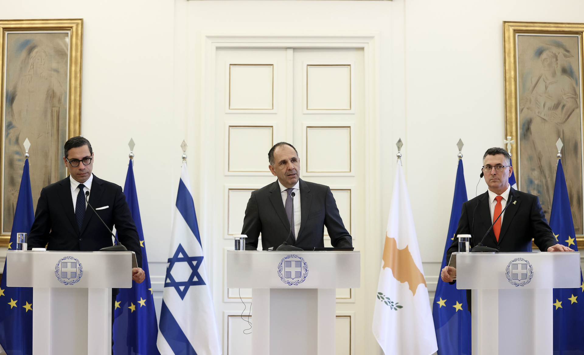 «Η προώθηση της περιφερειακής συνεργασίας μέσω της διασυνδεσιμότητας καθιστά την περιοχή μας πιο ασφαλή και ανθεκτική σε ένα περιβάλλον γενικότερης αστάθειας», ανέφερε ο υπουργός Εξωτερικών Γιώργος Γεραπετρίτης, μετά την ολοκλήρωση της τριμερούς συνάντησης Ελλάδας, Κύπρου και Ισραήλ στην Αθήνα, στην οποία συμμετείχαν ο υπουργός Εξωτερικών της Κυπριακής Δημοκρατίας, Κωνσταντίνος Κόμπος, και ο υπουργός Εξωτερικών του Ισραήλ, Γκίντεον Σαάρ.