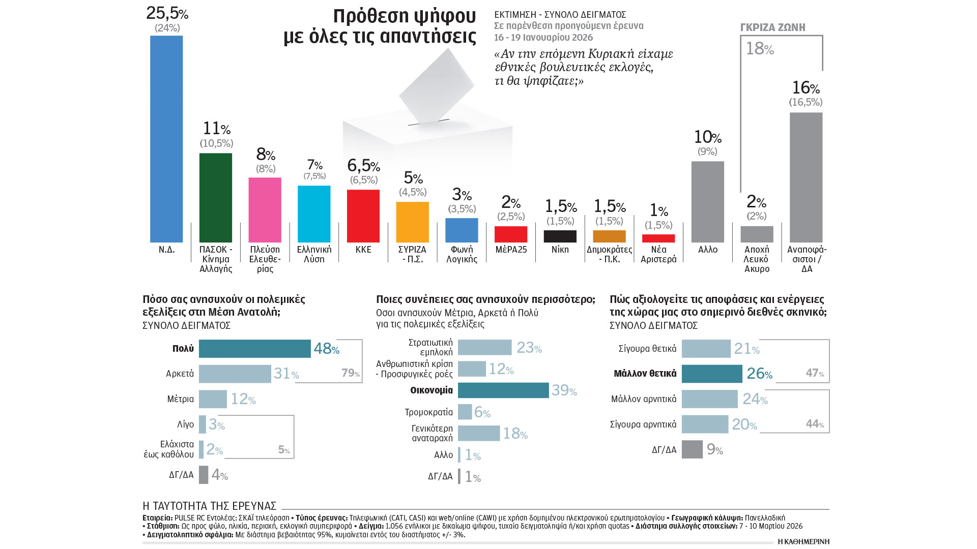 Με την ανησυχία από τις εξελίξεις στη Μέση Ανατολή να είναι ιδιαίτερα ισχυρή και τον κόσμο να στρέφει το βλέμμα του κυρίως στις οικονομικές επιπτώσεις μιας πιθανής παρατεταμένης και διευρυμένης πολεμικής σύρραξης, η δημοσκόπηση της Pulse για λογαριασμό του ΣΚΑΪ αποτυπώνει έπειτα από αρκετό καιρό μια μεγαλύτερη αύξηση των ποσοστών της κυβερνητικής παράταξης. Η έρευνα επιβεβαιώνει τον κανόνα της «συσπείρωσης γύρω από τη σημαία», με τη Νέα Δημοκρατία στην πρόθεση ψήφου να ανεβαίνει μιάμιση μονάδα σε σχέση με τα μέσα Ιανουαρίου και να φτάνει το 25,5%. Δεν είναι τυχαίο πως το 72% των ερωτηθέντων αξιολογεί «σίγουρα θετικά» ή «μάλλον θετικά» την πρωτοβουλία της χώρας μας να συνδράμει αμυντικά την Κύπρο.