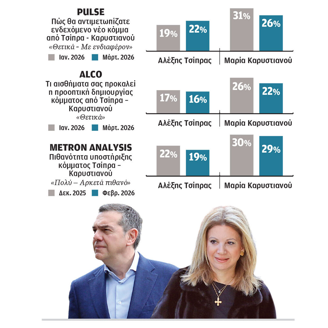 Στο ερώτημα προς τους πολίτες «τι αισθήματα σας προκαλεί η προοπτική δημιουργίας κόμματος από τον Αλέξη Τσίπρα», από την ALCO «θετικά» απάντησε τον Ιανουάριο του 2026 το 17% των συμμετεχόντων στην έρευνα και τον Μάρτιο το 16%. Για τη Μαρία Καρυστιανού οι απώλειες είναι μεγαλύτερες, με το 26% να απαντάει «θετικά» τον πρώτο μήνα του έτους και το 22% σήμερα.