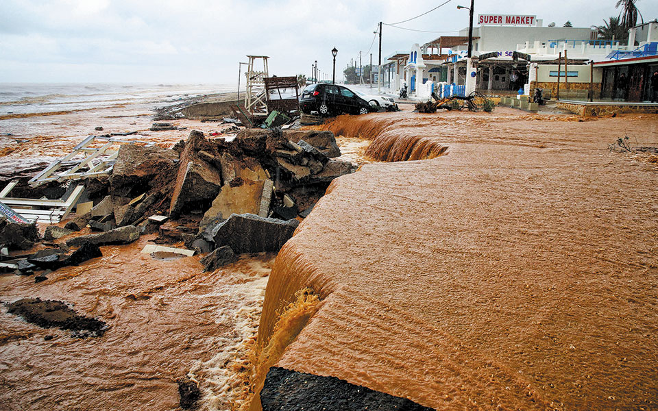 Εικόνες βιβλικής καταστροφής άφησε πίσω της η σύντομη αλλά σφοδρή κακοκαιρία που έπληξε ολόκληρη την Κρήτη και κυρίως τον Νομό Ηρακλείου, λίγες μόνο εβδομάδες μετά την αναπάντεχη χαλαζόπτωση της 20ής Οκτωβρίου. Η κατεστραμμένη από τις πλημμύρες Χερσόνησος της 10ης Νοεμβρίου δεν θυμίζει σε τίποτα τον ξέγνοιαστο προορισμό διακοπών χιλιάδων τουριστών… Τα ακραία καιρικά φαινόμενα εκδηλώθηκαν από τη νύχτα της Δευτέρας, πλήττοντας ιδιαίτερα την Ανάληψη, τη Σταλίδα, τις Γούρνες, τις Γούβες, τα Μάλια, την Επισκοπή και τον Μοχό του Δήμου Χερσονήσου. Οι δρόμοι μετατράπηκαν σε ποτάμια, αυλές και ισόγεια οικήματα πλημμύρισαν, σπίτια ολόκληρα θάφτηκαν κάτω από τη λάσπη. Πολλά οχήματα παρασύρθηκαν από τα ορμητικά νερά και μάλιστα στις Γούρνες ένα αυτοκίνητο με αναμμένα τα αλάρμ έφτασε έως τη θάλασσα. Ο Γαζανός ποταμός υπερχείλισε με συνέπεια τα νερά του να ενωθούν με τη θάλασσα, θέτοντας σε κίνδυνο τους κατοίκους των γύρω περιοχών. Σε ορισμένα σημεία του ΒΟΑΚ δημιουργήθηκαν καταρράκτες.