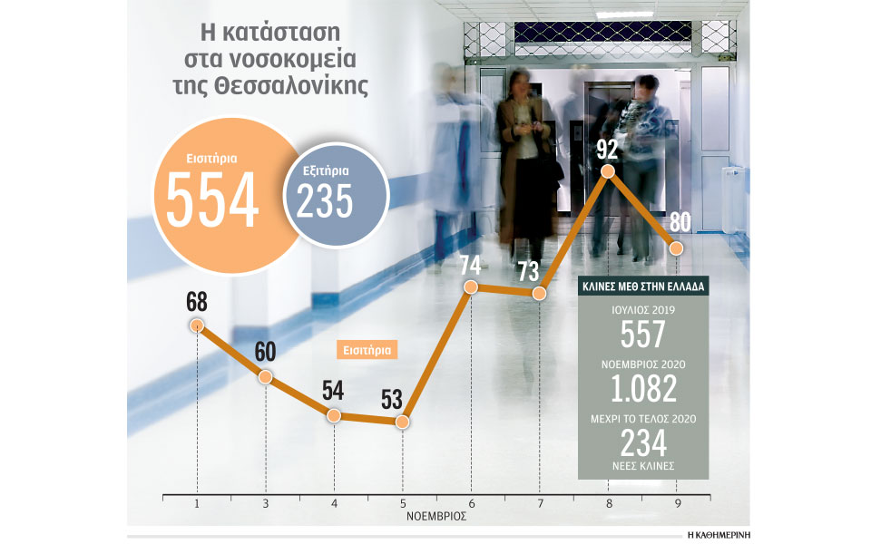 Στην Αττική, αντίστοιχα, από τις 164 κλίνες Εντατικής COVID-19, κενές ήταν χθες το πρωί οι 48. Το υπουργείο Υγείας προχωρεί στη δημιουργία έως αύριο 50 νέων κλινών στη Θεσσαλονίκη, από τη μετατροπή νευροχειρουργικών, καρδιοχειρουργικών και αγγειοχειρουργικών μονάδων σε μονάδες εντατικής θεραπείας COVID-19, με τον εξοπλισμό που έχει ως στρατηγικό απόθεμα το υπουργείο Υγείας. Σε μονάδα νοσηλείας ασθενών COVID-19 πρόκειται να μετατραπεί πτέρυγα του Γενικού Στρατιωτικού Νοσοκομείου 424 στη συμπρωτεύουσα.
