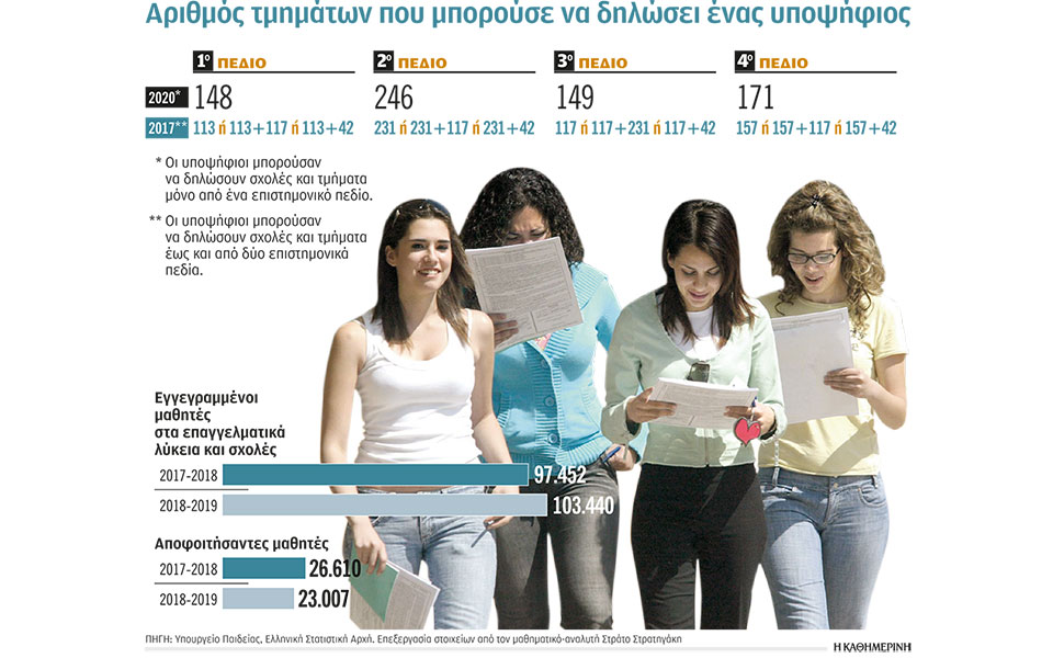Λιγότερες σχολές θα μπορούν να επιλέξουν οι υποψήφιοι των Πανελλαδικών Εξετάσεων του 2021, όταν θα συμπληρώσουν το μηχανογραφικό τους δελτίο για την εισαγωγή στα ΑΕΙ. Με το μέτρο αυτό, η ηγεσία του υπουργείου Παιδείας στοχεύει να περιορίσει τη «σωρηδόν» δήλωση σχολών από τους υποψηφίους, όπως συμβαίνει έως τώρα. Αντίθετα, ο περιορισμός των επιλογών θα μπορούσε να ωθήσει σε πιο συνειδητοποιημένη επιλογή σχολών. Το μέτρο θα συνδυαστεί με ενίσχυση της επαγγελματικής εκπαίδευσης. Το υπουργείο, μέσω νομοσχεδίου που θα κατατεθεί προς ψήφιση στη Βουλή, στοχεύει να βελτιώσει το περιεχόμενο σπουδών της επαγγελματικής εκπαίδευσης, και να δημιουργήσει νέες ειδικότητες στον τομέα της κατάρτισης, τις οποίες θα χρειάζονται η οικονομία και η αγορά εργασίας. Αλλωστε, στον σχεδιασμό των ειδικοτήτων θα εμπλακούν οι επαγγελματικοί φορείς κάθε Περιφέρειας.