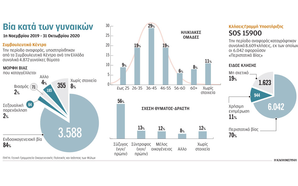 Ειδικότερα, σύμφωνα με την έκθεση, που αναλύει στοιχεία από 1ης Νοεμβρίου 2019 έως 31 Οκτωβρίου 2020, υποστηρίχθηκαν από τα συμβουλευτικά κέντρα του δικτύου της γενικής γραμματείας ανά την Ελλάδα συνολικά 4.872 γυναίκες θύματα βίας και πολλαπλών διακρίσεων, καθώς και τρίτα πρόσωπα (π.χ. η μητέρα, ενήλικη κόρη του θύματος κ.ά.). Το 38,5% εξυπηρετήθηκε στα 8 συμβουλευτικά κέντρα της Αττικής, το 7% εξυπηρετήθηκε στη Θεσσαλονίκη, το 5,6% στην Κρήτη, το 3,9% στην Καβάλα, το 3,7% στην Πάτρα κ.ο.κ. Η επικρατέστερη μορφή βίας ήταν η ενδοοικογενειακή (84%), ενώ ακολουθούν η σεξουαλική παρενόχληση και ο βιασμός (από 2%). Στο 56% των υποθέσεων, η σχέση θύματος – θύτη ήταν κυρίως συζυγική (νυν ή πρώην), στο 13% συντροφική (νυν ή πρώην), ενώ το 12% των γυναικών θυμάτων που εξυπηρετήθηκαν από τα συμβουλευτικά κέντρα ανέφεραν ότι ο θύτης ήταν μέλος της οικογένειας (π.χ. αδελφός, πατέρας ή και άλλος συγγενής). Την ίδια περίοδο, στους ξενώνες φιλοξενίας του δικτύου φιλοξενήθηκαν συνολικά 269 γυναίκες και 270 παιδιά.