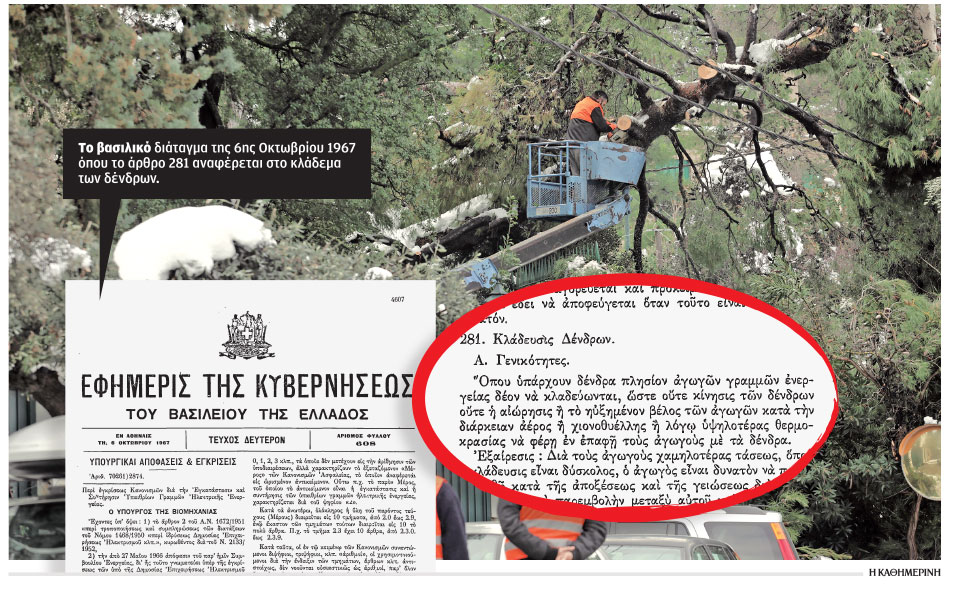 Στο φύλλο της Εφημερίδας της Κυβερνήσεως της 6ης Οκτωβρίου 1967, με τίτλο «Περί εγκρίσεως Κανονισμών διά την Εγκατάστασιν και Συντήρησιν Υπαίθριων Γραμμών Ηλεκτρικής Ενέργειας», στο άρθρο 281 αναφέρεται χαρακτηριστικά: «Οπου υπάρχουν δένδρα πλησίον αγωγών γραμμών ενεργείας δέον να κλαδεύωνται, ώστε ούτε η κίνησις των δένδρων ούτε η αιώρησις ή το ηυξημένον βέλος των αγωγών κατά τη διάρκεια αέρος ή χιονοθυέλλης ή λόγω υψηλοτέρας θερμοκρασίας να φέρη εν επαφή τους αγωγούς με τα δένδρα». Ούτε εκείνη η υπουργική απόφαση ούτε όποιες άλλες ακολούθησαν τα επόμενα 54 χρόνια κατόρθωσαν να προσδιορίσουν ποιος πρέπει να κάνει τι.