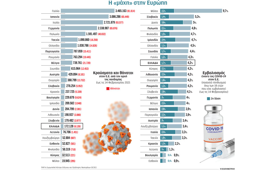 Το χρονοδιάγραμμα εξαρτάται σαφώς και από τις ποσότητες εμβολίων που θα παραλαμβάνει η χώρα. Υπενθυμίζεται ότι έως το τέλος Μαρτίου αναμένεται να έχουμε παραλάβει συνολικά 1.400.000 δόσεις του εμβολίου των Pfizer/BioNTech, 240.000 δόσεις του εμβολίου της Moderna και 950.000 δόσεις της AstraZeneca, που επαρκούν για τον εμβολιασμό 1.300.000 ατόμων. Το δεύτερο τρίμηνο του έτους αναμένεται να αυξηθεί η διαθεσιμότητα των εμβολίων, ενώ το εμβολιαστικό πρόγραμμα θα εντείνει η –εκτός απροόπτου– επικείμενη έγκριση του εμβολίου της Johnson & Johnson που χορηγείται σε μία δόση και από το οποίο, με βάση τη συμφωνία της Ε.Ε. με την εταιρεία, η Ελλάδα θα λάβει 1.200.000 δόσεις το διάστημα Απριλίου – Ιουνίου.
