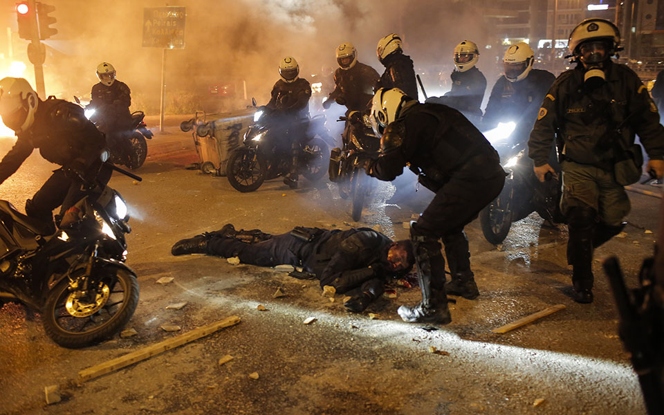 Οι κουκουλοφόροι κατάφεραν να ανατρέψουν μία μοτοσικλέτα και επιτέθηκαν στον αστυνομικό, ο οποίος βρέθηκε αιμόφυρτος στο έδαφος δεχόμενος χτυπήματα στο κεφάλι, αρχικά φορώντας το κράνος, το οποίο στη συνέχεια του το αφαίρεσαν και συνέχισαν να τον χτυπούν, μέχρι οι συνάδελφοί του να καταφέρουν να απωθήσουν τους δράστες της επίθεσης.
