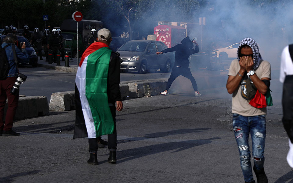 Όταν οι διαδηλωτές έφτασαν στην συμβολή της Κηφισίας με την Κατεχάκη, όπου βρίσκεται η πρεσβεία του Ισραήλ στην Αθήνα, επιτέθηκαν με πέτρες και άλλα αντικείμενα εναντίον των δυνάμεων των ΜΑΤ, που είχαν αποκλείσει την περιοχή. Οι αστυνομικές δυνάμεις απάντησαν με χρήση χημικών αλλά και την «Αύρα», το όχημα που εκτοξεύει νερό.