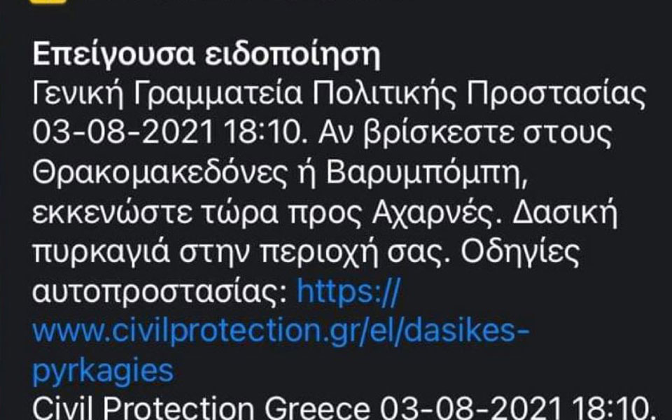 Στο μήνυμα αναγράφεται: «SOS: Αν βρίσκεστε στους Θρακομακεδόνες ή Βαρυμπόμπη Αττικής, εκκενώστε τώρα προς Αχαρνές