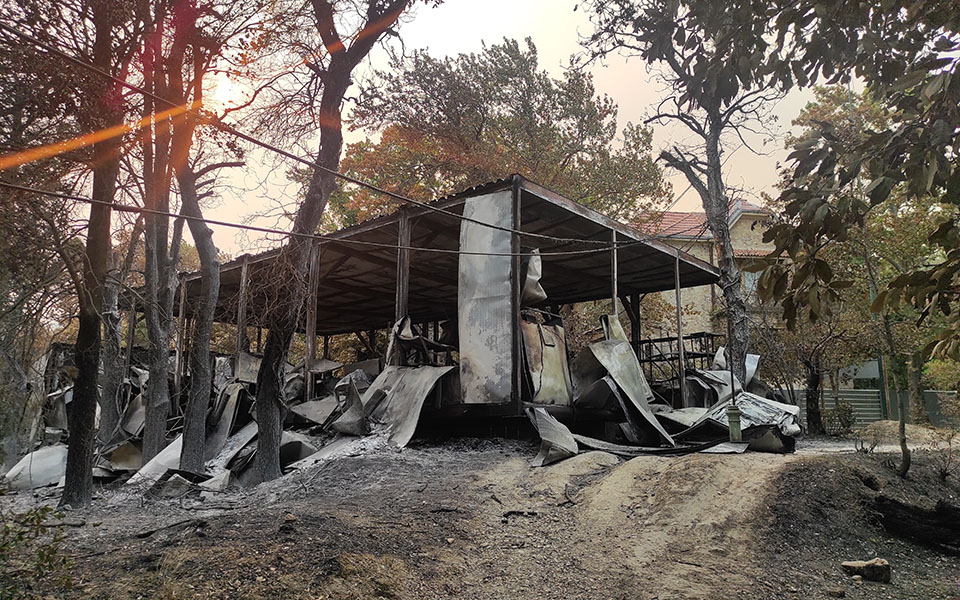 Η μυρωδιά είναι έντονη, τρυπάει τη μύτη. Τη χρωματική μονοτονία του μαύρου και του γκρι σπάνε ανά κάποιες εκατοντάδες μέτρα σακούλες σκουπιδιών, με ποτήρια καφέ και μπουκάλια νερού, προφανώς από αυτούς που εργάστηκαν στην καταπολέμηση της φωτιάς.
