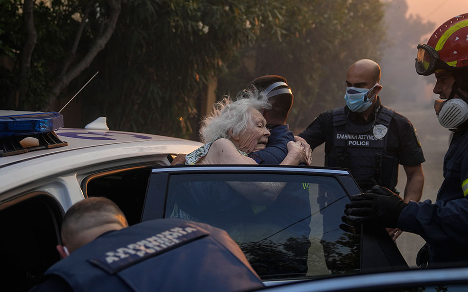 Στο Ντράφι, σύμφωνα με την ΕΡΤ, στη συμβολή των οδών Παπαδιαμάντη και Καβάφη πληρώματα της Άμεσης Δράσης από δυο περιπολικά απεγκλώβισαν τουλάχιστον 15 ηλικιωμένους, με τα δύο οχήματα της αστυνομίας να περνούν κυριολεκτικά μέσα από τις φλόγες.