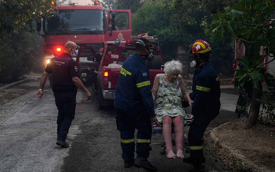 Ηλικιωμένη απομακρύνεται από το σπίτι της με τη βοήθεια πυροσβεστών και αστυνομικών