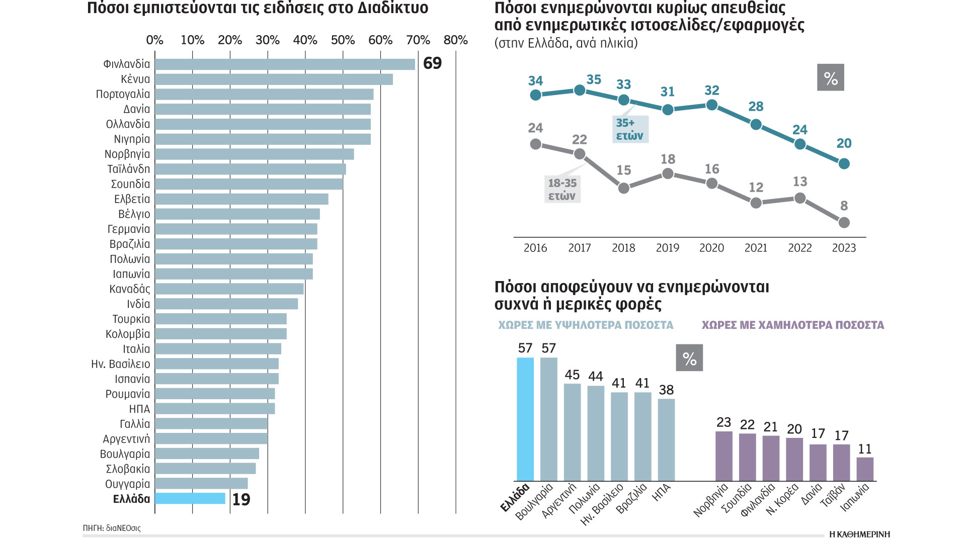 Oλο και λιγότερη εμπιστοσύνη στις ειδήσεις που παρουσιάζουν τα ψηφιακά μέσα μαζικής ενημέρωσης (MME) έχουν οι πολίτες στην Ελλάδα. Μάλιστα τείνουν να αποφεύγουν τις άλλοτε «δημοφιλείς ειδήσεις» όπως ο πόλεμος στην Ουκρανία, τα αθλητικά αλλά και αστυνομικές ειδήσεις, ενώ ενδιαφέρονται περισσότερο για θετικές ειδήσεις, πληροφορίες που τους αφορούν αλλά και εκείνες που τους προτείνουν λύσεις στα προβλήματά τους. Οι πολίτες στην Ελλάδα που χρησιμοποιούν το Διαδίκτυο για την ενημέρωσή τους «μπαίνουν» όλο και λιγότερο στις ιστοσελίδες και στα μέσα κοινωνικής δικτύωσης (MΚΔ) των παραδοσιακών μέσων ενημέρωσης, ειδικά οι νεότεροι εξ αυτών. Προτιμούν την ενημέρωση μέσω μηνυμάτων στο Viber ή το Messenger. Ταυτόχρονα ανεβαίνει και η δημοφιλία των Instagram και ΤikΤok, οπότε η άποψη των διασήμων και των influencers αποκτά ολοένα και μεγαλύτερη αξία. Πρόκειται για στοιχεία της ετήσιας έκθεσης του 2023 για την ενημέρωση στο Διαδίκτυο (Digital News Report) που υλοποιείται από το ινστιτούτο Reuters για τη Μελέτη της Δημοσιογραφίας του Πανεπιστημίου της Οξφόρδης σε 46 χώρες. Τα στοιχεία για την Ελλάδα βασίζονται στις απαντήσεις δείγματος 2.023 ατόμων (χρόνος δημοσκόπησης: μέσα Ιανουαρίου – αρχές Φεβρουαρίου του 2023), τα οποία έχουν πρόσβαση στο Διαδίκτυο (δηλαδή το 79% του πληθυσμού της Ελλάδας).