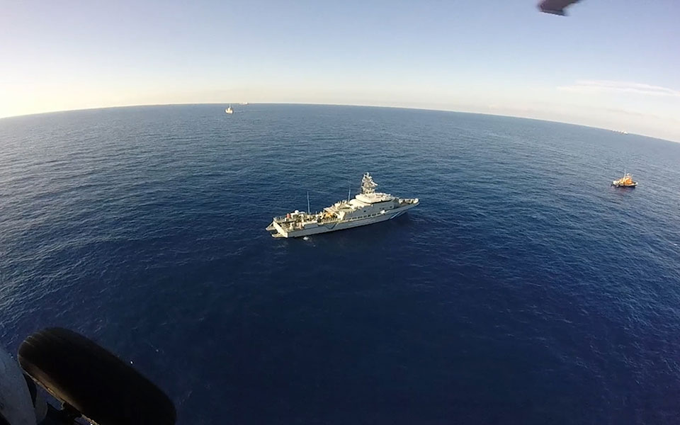 Οι έρευνες συνεχίζονται από μία φρεγάτα του Πολεμικού Ναυτικού, τρία παραπλέοντα πλοία, ένα ελικόπτερο και ένα αεροσκάφος του Λιμενικού Σώματος.