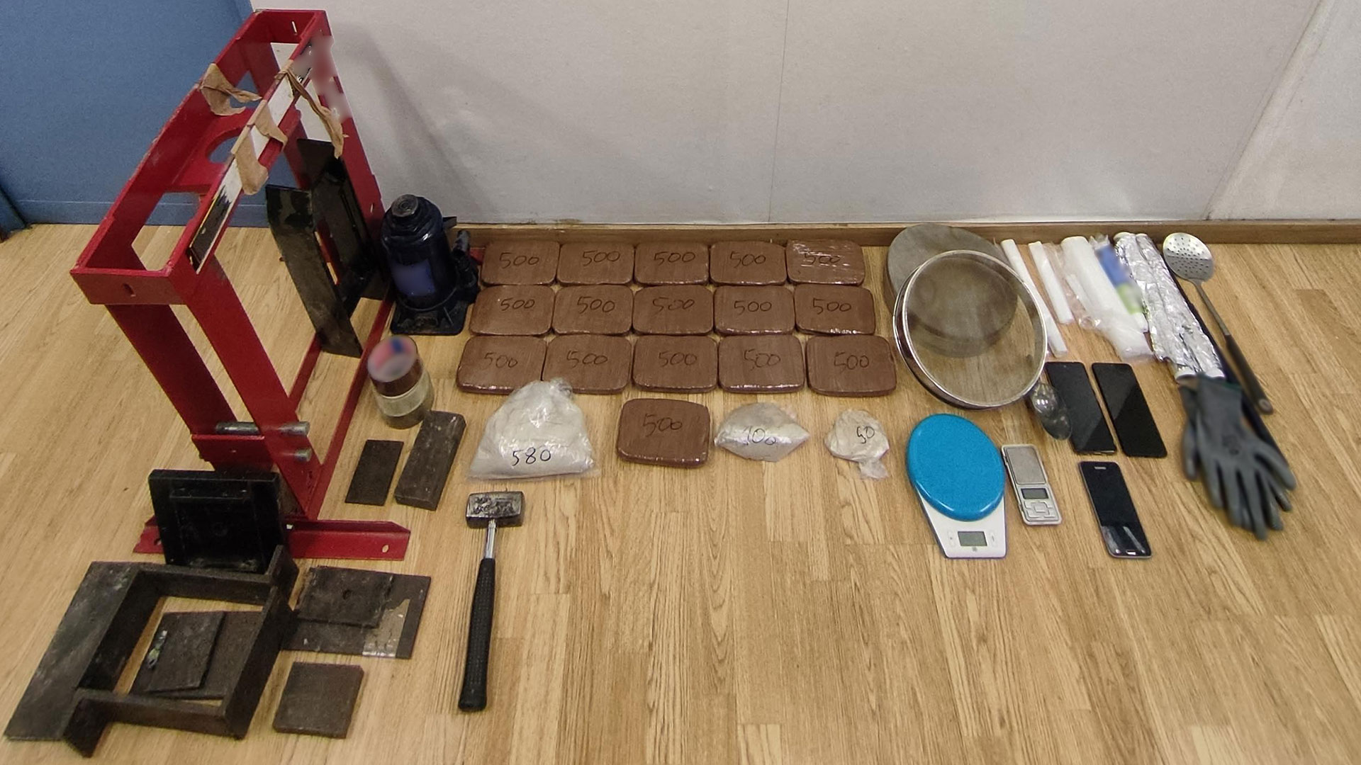 Έπειτα από έρευνα που πραγματοποιήθηκε στην οικία του συλληφθέντα στον Πειραιά, βρέθηκε εξοπλισμένο εργαστήριο νόθευσης και επανατυποποίησης ηρωίνης.