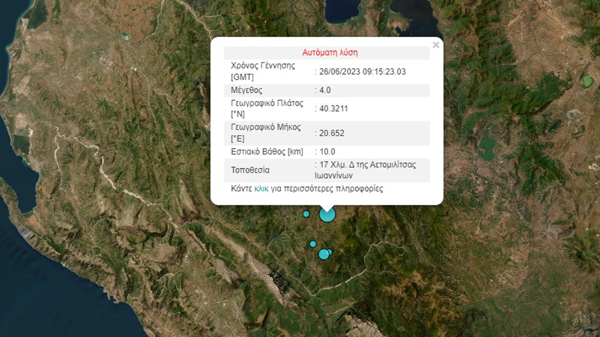 Σύμφωνα με το Γεωδυναμικό ινστιτούτο, το επίκεντρο της σεισμικής δόνησης εντοπίζεται στα 17χλμ δυτικά της Αετομιλίτσας Ιωαννίνων.