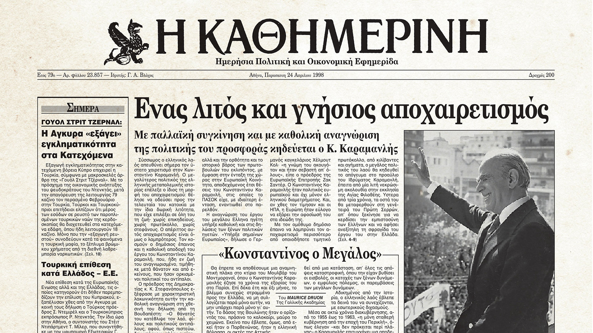 «Σύσσωμος ο ελληνικός λαός απευθύνει σήμερα τον ύστατο χαιρετισμό στον Κωνσταντίνο Καραμανλή», έγραφε στο πρωτοσέλιδό της η «Καθημερινή» στις 24 Απριλίου 1998. Την προηγούμενη ημέρα, ο μεγάλος πολιτικός είχε φύγει από τη ζωή σε ηλικία 92 ετών.