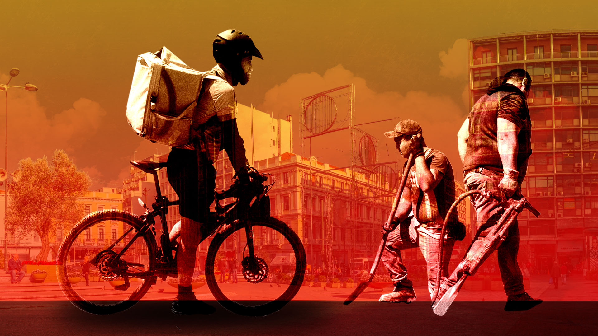 Η ώρα έχει πάει 15:00. Στη συμβολή των οδών Σταδίου και Καραγιώργη Σερβίας, άλλος ένας εργαζόμενος delivery περιμένει το φανάρι να γίνει πράσινο πάνω σε ένα ποδήλατο. Δεν θέλει να κάνει κάποιο σχόλιο, λέει πως βιάζεται. Σύμφωνα με τα στοιχεία του meteo, εκείνη την ώρα η θερμοκρασία ήταν 38 βαθμοί Κελσίου και η υγρασία 37%. Ο ίδιος μάλλον δεν γνωρίζει αν η θερμοκρασία είναι ήδη απαγορευτική βάσει του Δείκτη Θερμικού Στρες, όμως, όπως και να έχει, η αίσθηση για κάποιον που απλώς περπατά στο κέντρο της πόλης, είναι το λιγότερο, δυσφορία.