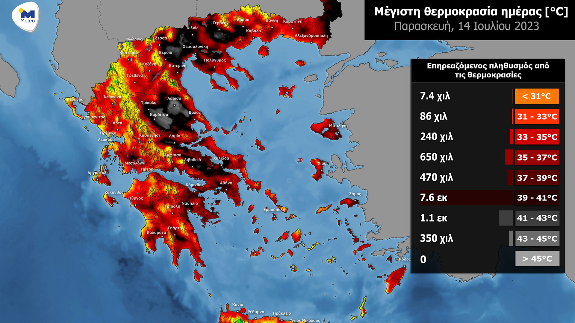 Σήμερα, Παρασκευή, κορυφώθηκε το κύμα καύσωνα, σύμφωνα με στοιχεία του Εθνικού Αστεροσκοπείου Αθηνών / meteo.gr, με αποτέλεσμα την έκθεση του μεγαλύτερου μέρους του πληθυσμού σε πολύ υψηλές μέγιστες θερμοκρασίες.