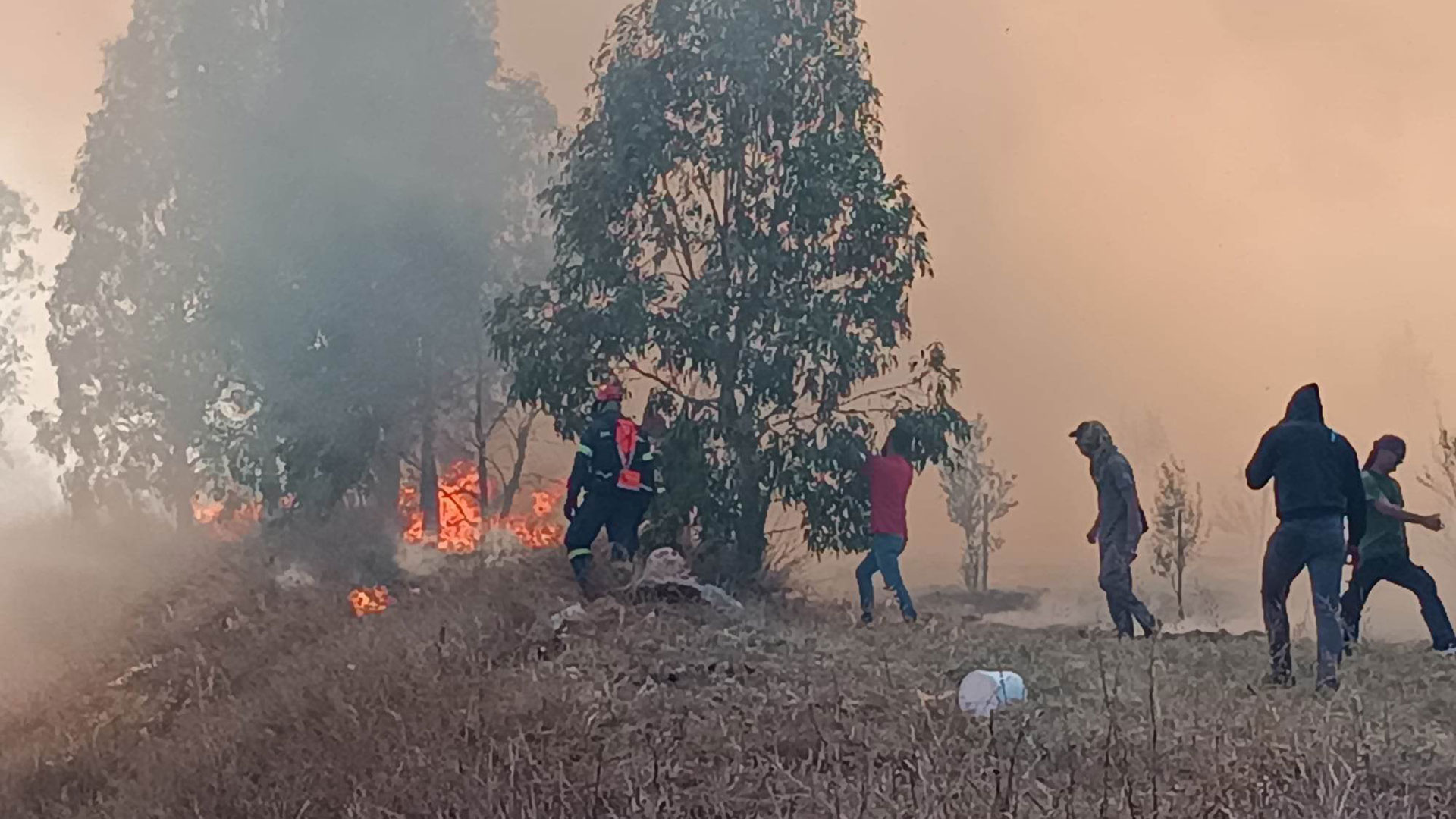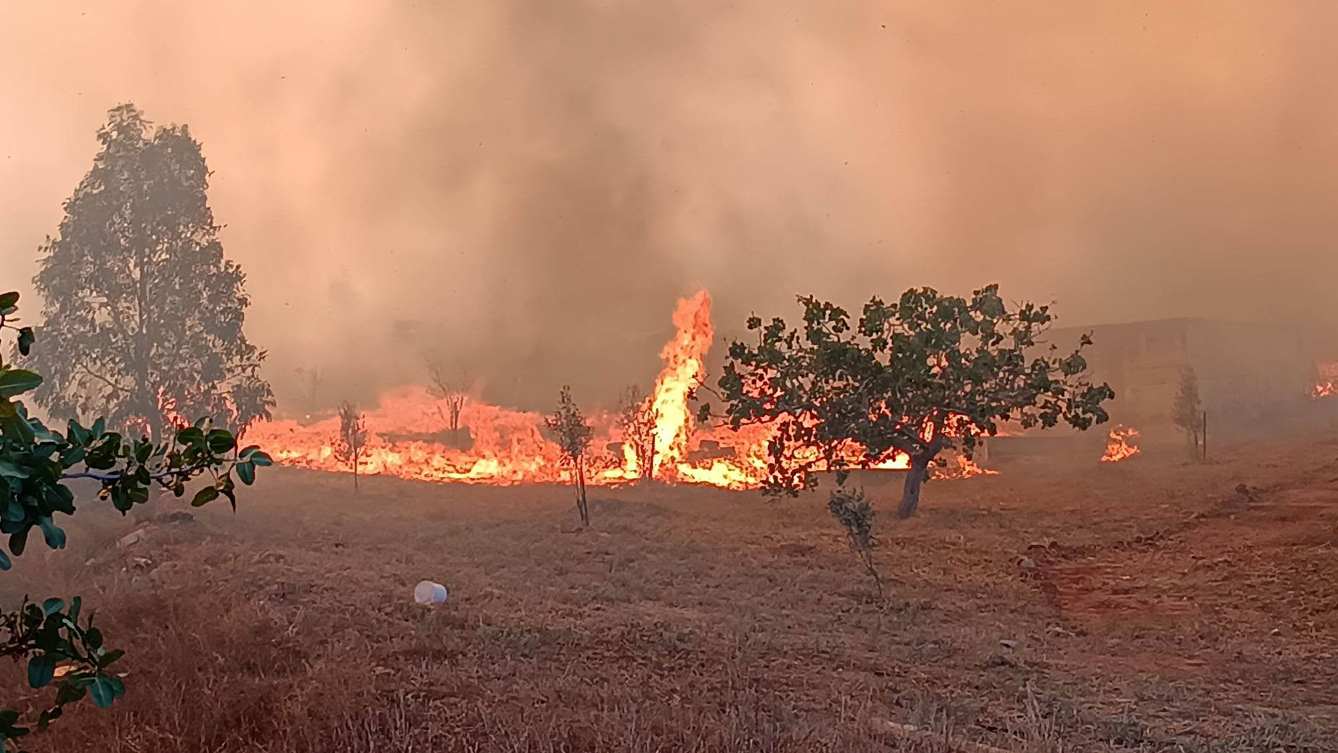 Με μάνικες και αυτοσχέδια μέσα προσπαθούν οι κάτοικοι να σβήσουν τις φλόγες κοντά στα σπίτια και τις περιουσίες τους.