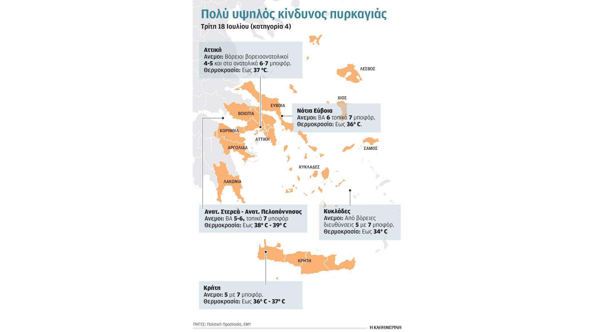 Για σήμερα Τρίτη 18 Ιουλίου η Γενική Γραμματεία Πολιτικής Προστασίας προειδοποιεί για πολύ υψηλό κίνδυνο εκδήλωσης δασικών πυρκαγιών (κατηγορίας 4) στις εξής περιοχές: Αττική, τμήματα της Βοιωτίας, κεντρική και νότια Εύβοια, Κορινθία, Αργολίδα, τμήματα της Λακωνίας, Κυκλάδες, νησιά βορείου Αιγαίου (Λέσβος, Σάμος, Χίος, Ικαρία) και Κρήτη.