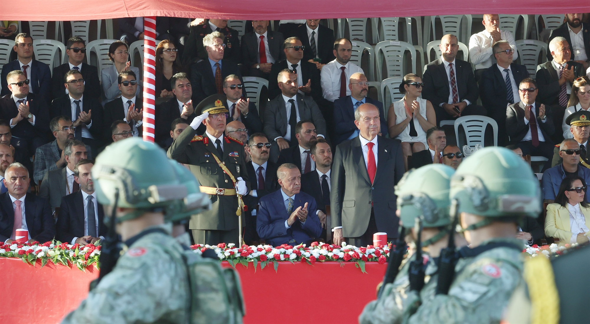 Αργότερα ο κ. Ερντογάν είχε συνάντηση με τον κ. Τατάρ και μαζί παρακολούθησαν τη στρατιωτική παρέλαση που πραγματοποιήθηκε στην κατεχόμενη Λευκωσία με αφορμή τις εκδηλώσεις γι’ αυτό που στα Κατεχόμενα αποκαλείται «στρατιωτική επιχείρηση της Τουρκίας στην Κύπρο» το 1974. Στη συγκεκριμένη τελετή, ο πρόεδρος της Τουρκίας υποστήριξε πως «ο τουρκικός στρατός με τον θρίαμβο της επιχείρησης έφερε στο νησί ασφάλεια, σταθερότητα και ειρήνη». Ο κ. Ερντογάν δήλωσε ότι «δεν υπάρχει περίπτωση επιβίωσης μιας ομοσπονδιακής λύσης. Αν δεν αναγνωριστεί η ισότιμη κυριαρχία και το διεθνές ισότιμο καθεστώς των Τουρκοκυπρίων, δεν υπάρχει καμία περίπτωση επανέναρξης συνομιλιών». Ο Τούρκος πρόεδρος ζήτησε από τη διεθνή κοινότητα «να μη γυρίσει την πλάτη στην πραγματικότητα» και να αναγνωρίσει το ψευδοκράτος.