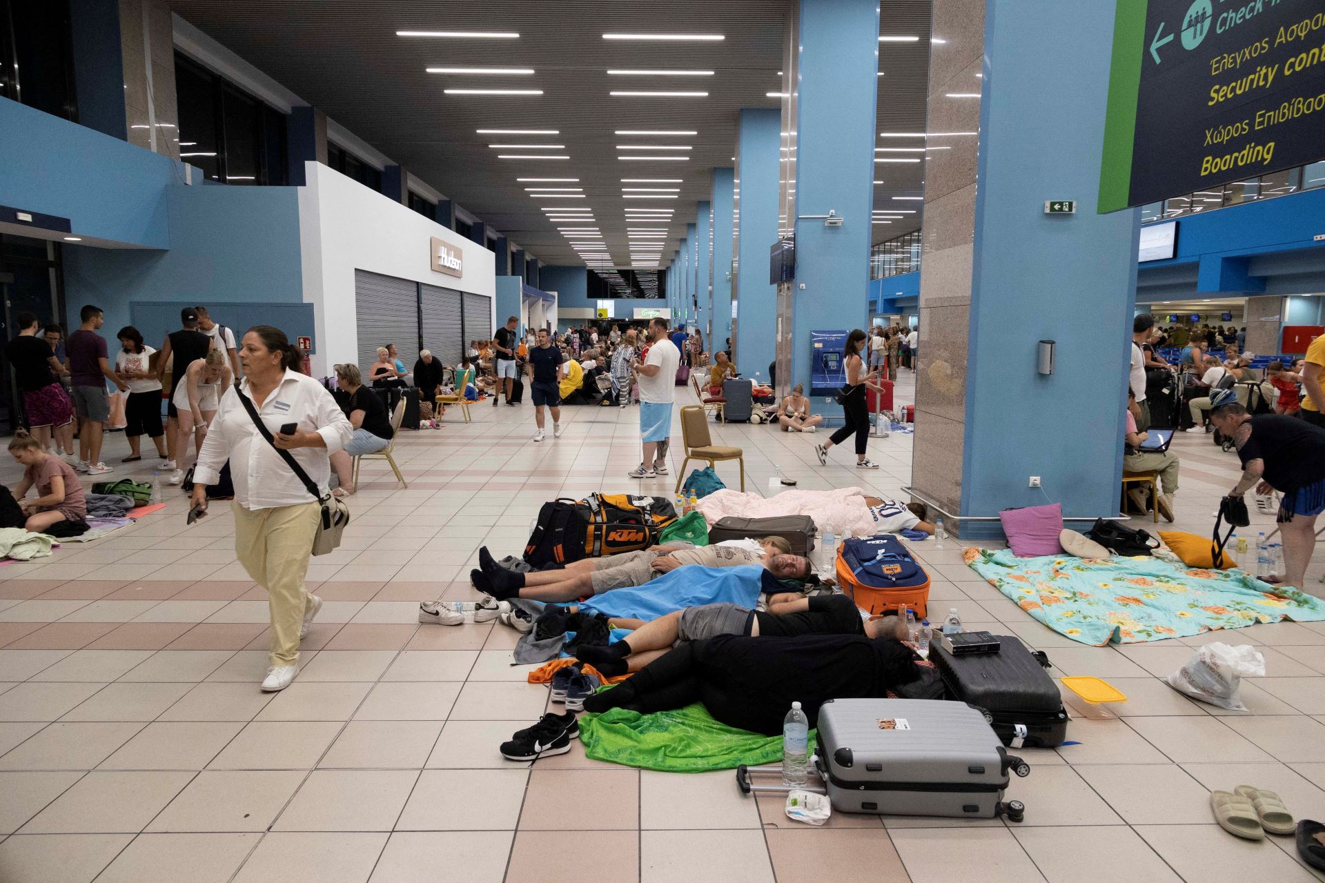 Πάνω σε βαλίτσες, σε ενωμένες μεταξύ τους καρέκλες ή και σε ιμάντες αποσκευών του αεροδρομίου της Ρόδου, πάνω σε σεντόνια, μπλούζες ή και κατάχαμα, οι τουρίστες προσπάθησαν να ξεκουράσουν την εξουθένωσή τους, περιμένοντας τις πτήσεις επιστροφής.