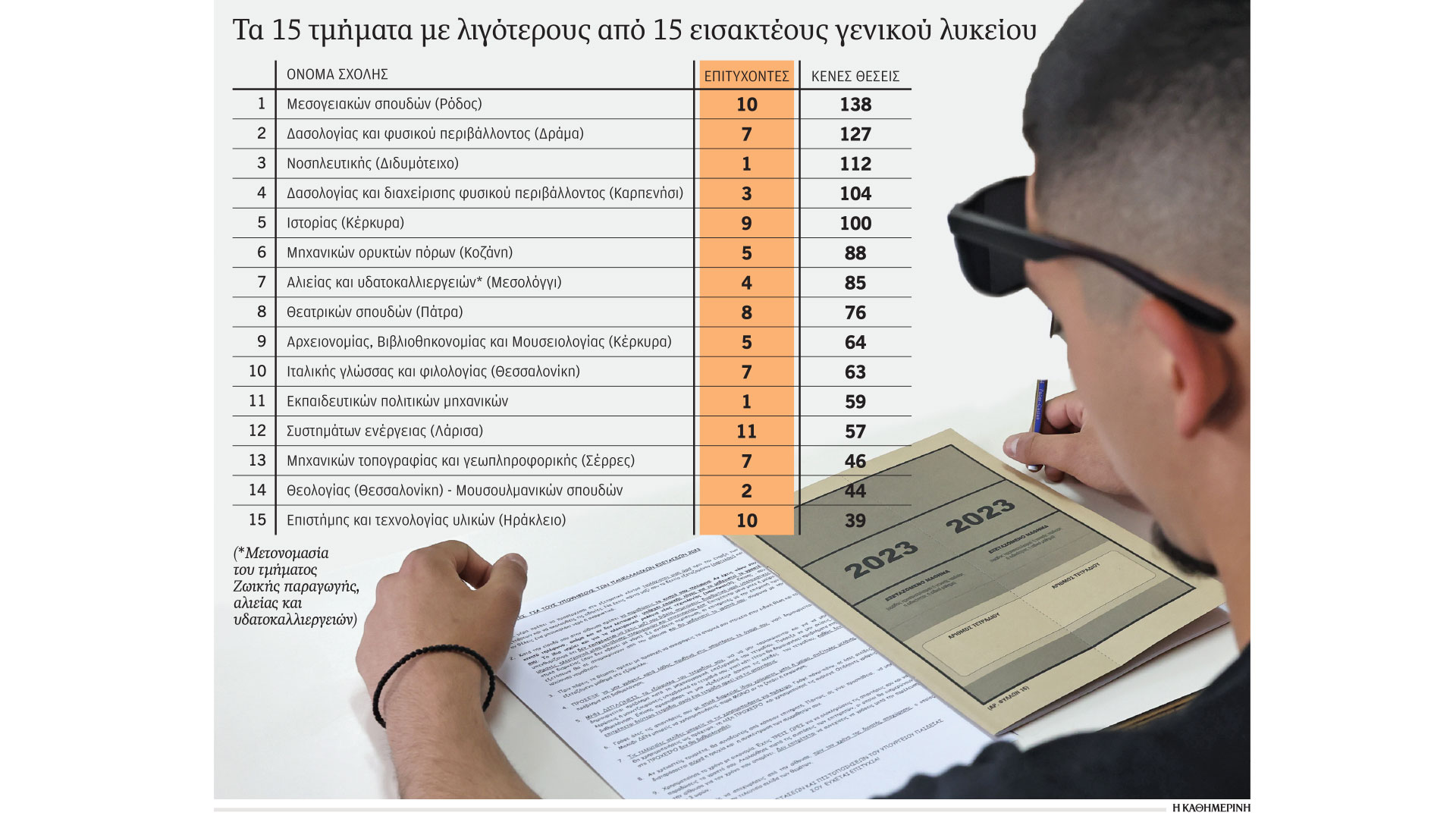 Από τα 450 πανεπιστημιακά τμήματα συνολικά, τα 154 έχουν κενές θέσεις. Σε δεινότερη θέση είναι τα τμήματα με πολύ μικρό αριθμό νέων φοιτητών. Χαρακτηριστικά, υπάρχουν τμήματα που ο αριθμός των εισακτέων είναι ίσος με αυτόν μιας… σχολικής τάξης. Ενδεικτικά, το Τμήμα Νοσηλευτικής στο Διδυμότειχο, με 1 εισακτέο από ΓΕΛ και 13 από ΕΠΑΛ, και το Αειφορικής Γεωργίας στην Αμφισσα που δεν είχε ούτε έναν εισακτέο από γενικό λύκειο και 12 από ΕΠΑΛ. Μάλιστα το δεύτερο θα λειτουργήσει για πρώτη φορά το επόμενο ακαδημαϊκό έτος. Συνολικά 14 τμήματα περιφερειακών ΑΕΙ είχαν έως 10 εισακτέους από γενικό λύκειο και θα ενισχυθούν από τους αποφοίτους των ΕΠΑΛ για να επιβιώσουν. Αλλά έως πότε;