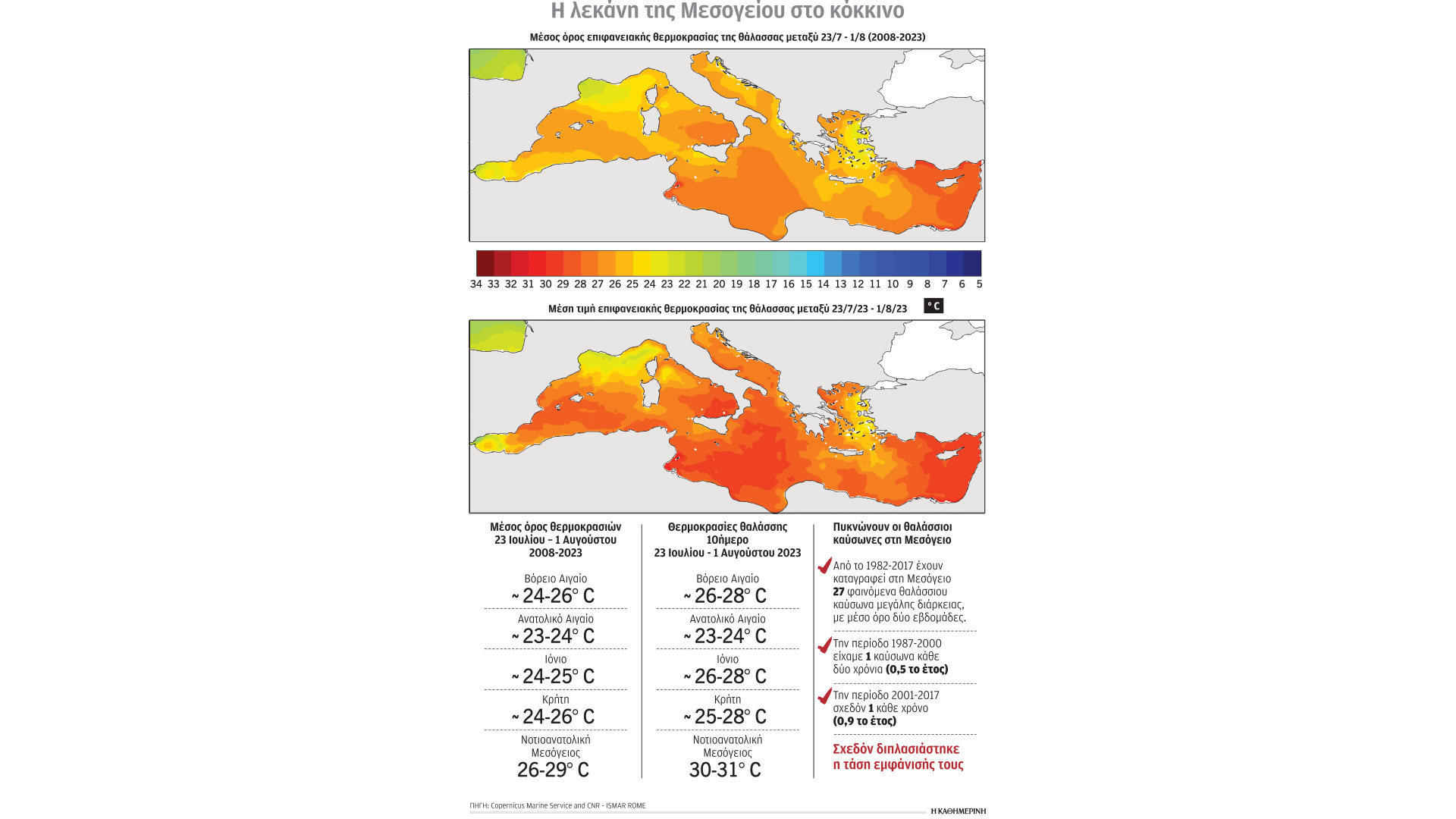 Σύμφωνα με στοιχεία από δορυφόρους, οι θερμοκρασίες των υδάτων το 10ήμερο 23 Ιουλίου – 1 Αυγούστου σε διάφορες περιοχές κυμάνθηκαν ως εξής: βόρειο Αιγαίο 26° C – 28° C, ανατολικό Αιγαίο 23° C – 24° C, Ιόνιο 26° C – 28 °C, Κρήτη 25° C – 28° C, ενώ στη νοτιοανατολική Μεσόγειο το θερμόμετρο έφτασε τους 30° C – 31° C. Πρόκειται για δεδομένα που προέρχονται από το Copernicus Marine Service και το CNR – ISMAR ROME.