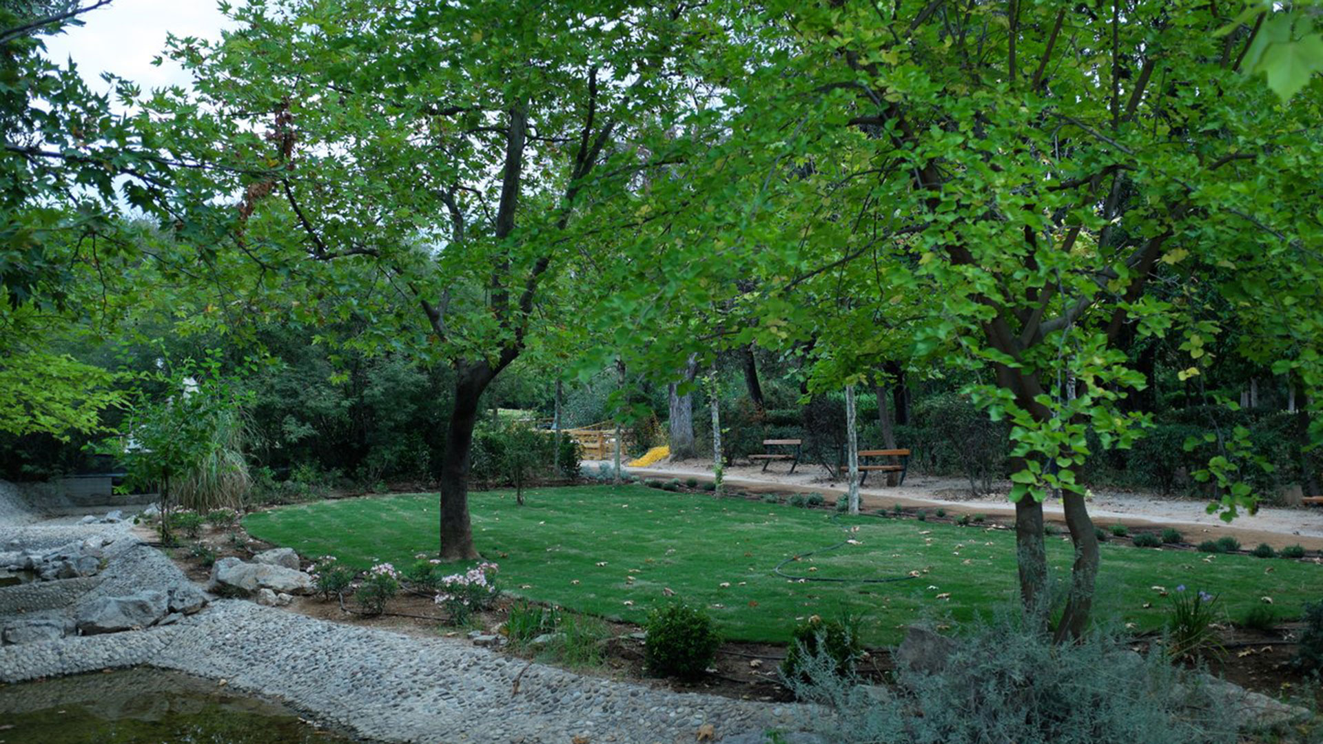 Στο κέντρο διαμορφώθηκε ένα δασικό μεσογειακό τοπίο με φυτά όπως η χαρουπιά, η κουκουναριά και η μυρτιά, ενώ από την άλλη πλευρά τοποθετήθηκαν φυτά όπως ο πλάτανος, η βελανιδιά και το σφενδάμιο, συνθέτοντας την εικόνα ενός ημιορεινού τοπίου. Οι εναλλαγές των φυτών δίνουν τη συνολική αίσθηση της Μεσογείου με διαφορετικές υφές και χρώματα.