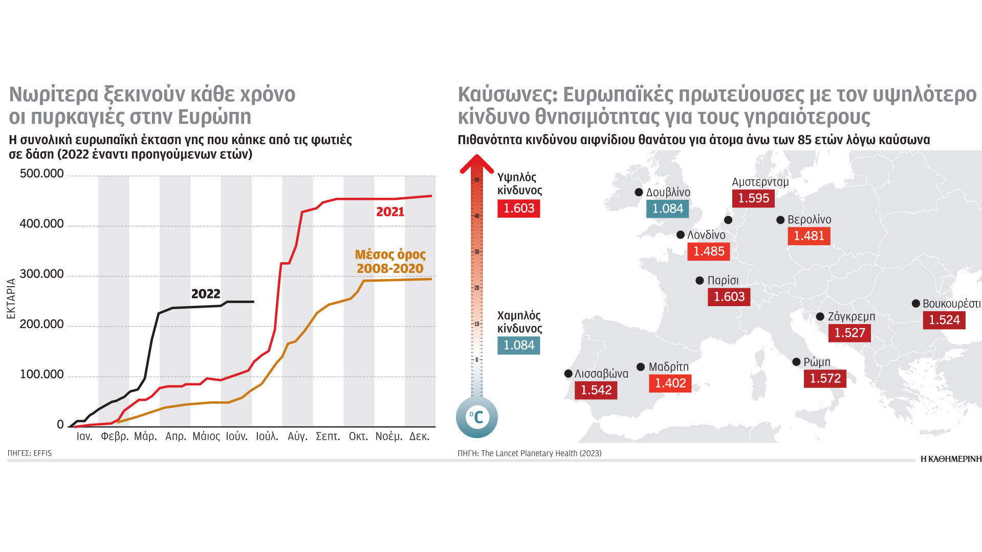 Σε Γαλλία και Ισπανία αντιστοιχεί το 40% της έκτασης της Ευρωπαϊκής Ενωσης που κάηκε το α΄ εξάμηνο του 2022 – ίσο με το 4πλάσιο του μέσου όρου της περιόδου 2008 – 2020. Αντίστοιχα φαινόμενα σε όλο τον ευρωπαϊκό Νότο συμβαίνουν το καλοκαίρι του 2023.