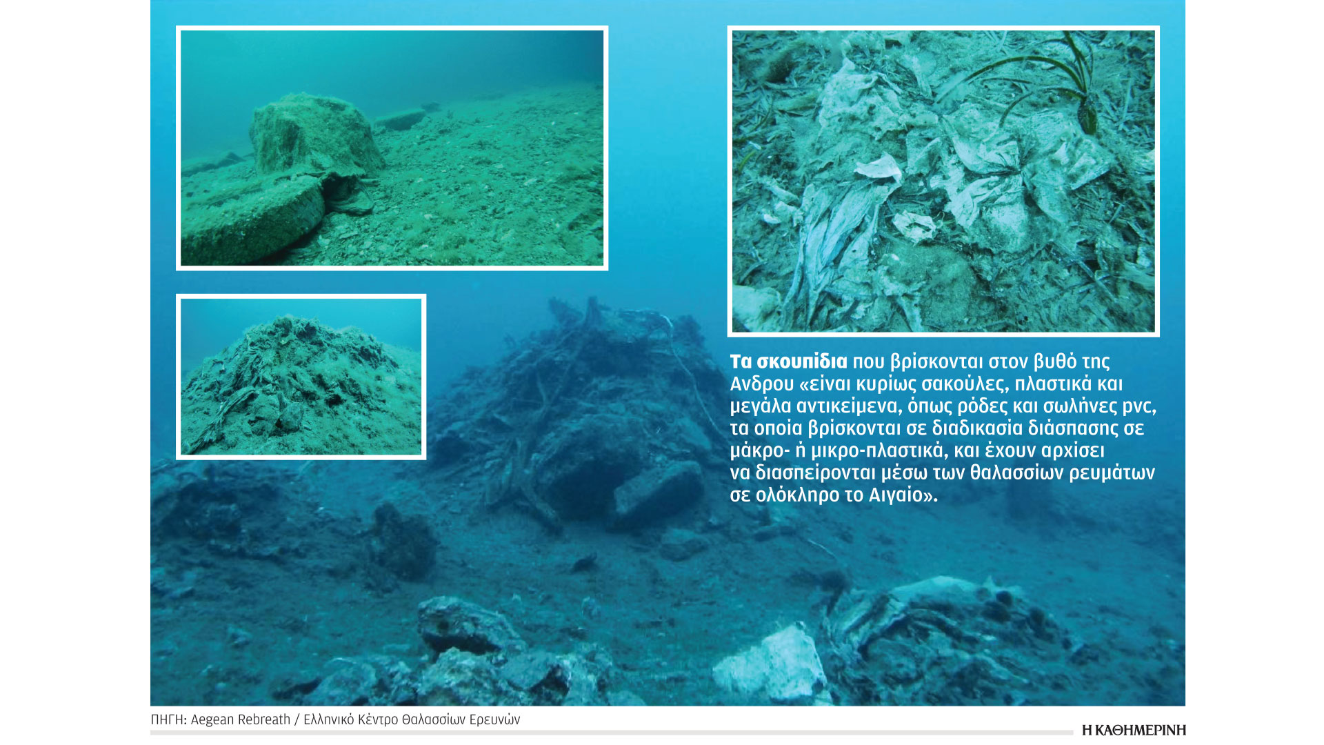 «Τα σκουπίδια βρίσκονται σε διαδικασία διάσπασης σε μακρο- ή μικρο-πλαστικά, γεγονός που επιβάλλει την άμεση και μεθοδική απομάκρυνσή τους από τον βυθό της Ανδρου, καθώς έχουν αρχίσει να διασπείρονται μέσω των θαλασσίων ρευμάτων σε ολόκληρο το Αιγαίο», λέει στην «Κ» ο επικεφαλής της Aegean Rebreath, Γιώργος Σαρελάκος. «Το γεγονός ότι το 2023, παρά τις υποσχέσεις του υπουργείου Περιβάλλοντος, τελικά κάναμε τη χαρτογράφηση με τη χορηγία μιας Γερμανίδας ιδιώτη –της κ. Νίνα Σνάμπελ– φανερώνει το γεγονός ότι η πολιτεία και ο Δήμος Ανδρου δεν θέλουν να αγγίξουν αυτό το τεράστιο πρόβλημα. Εμείς κάναμε το χρέος μας, ας τηρήσει η πολιτεία τις υποσχέσεις της».