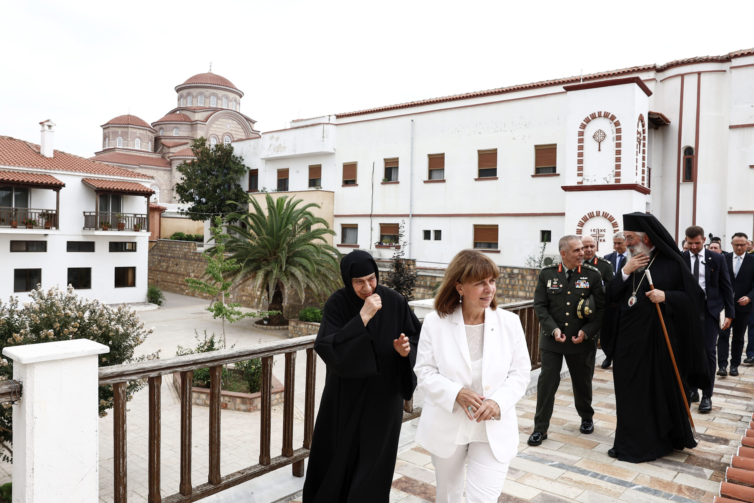 Η κ. Σακελλαροπούλου ξεναγήθηκε στους χώρους της Μονής από την ηγουμένη, τη γερόντισσα Μακρίνα, και στα εργαστήρια αγιογραφίας, κεντήματος, ψηδιδωτών και αμφίων.