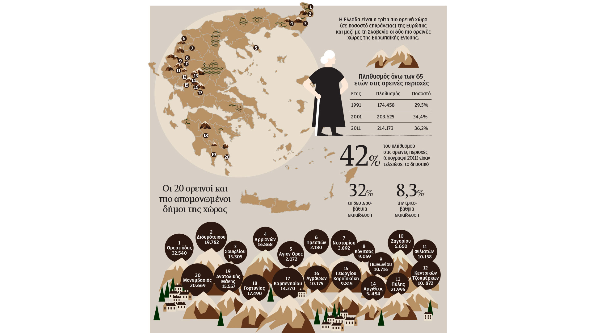 Η Ελλάδα, με το 78% της έκτασής της να είναι ορεινό είναι η 3η χώρα της Ευρώπης όσον αφορά την ορεινότητα, ενώ προηγούνται η Ελβετία και η Νορβηγία. Είναι ωστόσο πρώτη στην Ευρωπαϊκή Eνωση. Σε όλη τη χώρα 135 οικισμοί βρίσκονται σε υψόμετρο άνω των 1.200 μέτρων, 362 οικισμοί σε υψόμετρο 1.000-1.200 μέτρων και 1.370 οικισμοί σε υψόμετρο 700-1.000 μέτρων. Σύμφωνα με τα δεδομένα της έρευνας της ΕΑΤΑΑ, συνολικά 65 δήμοι σε όλη τη χώρα χαρακτηρίζονται ορεινοί (πάνω από 700 μέτρα υψόμετρο και πληθυσμιακή πυκνότητα χαμηλότερη των 85 ατόμων ανά τετραγωνικό χιλιόμετρο). Αρκετοί ορεινοί δήμοι βρίσκονται στα νησιά.