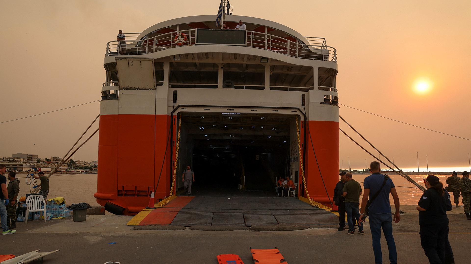 Το πλοίο αναχώρησε περίπου στις 11 το πρωί από το λιμάνι της πρωτεύουσας του νομού Εβρου, μετά από τη δραματική επιχείρηση εκκένωσης, καθώς οι φλόγες είχε περικυκλώσει το κτίριο.