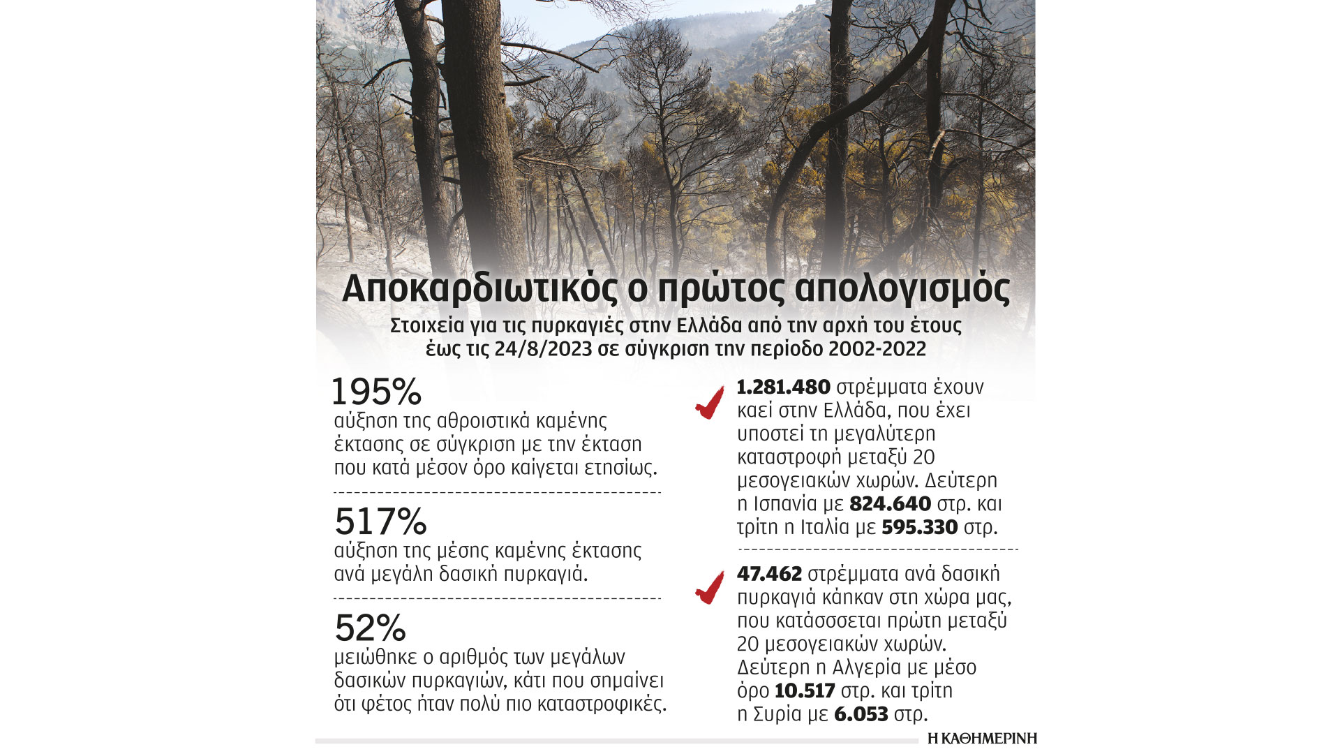 Καταγράφοντας, κατά μέσον όρο, 47.462 στρέμματα ανά δασική πυρκαγιά έως την Πέμπτη 24.8.2023, η Ελλάδα κατατάσσεται πρώτη μεταξύ 20 μεσογειακών χωρών, με τεράστια μάλιστα διαφορά. Δεύτερη έρχεται η Αλγερία με μέσο όρο 10.517 ανά δασική πυρκαγιά και τρίτη η Συρία με μέσο όρο 6.053 στρέμματα ανά δασική πυρκαγιά. Αυξήσεις σημειώνονται επίσης σε Τυνησία (+1%) και Ιταλία (+35%), με τις υπόλοιπες χώρες να παρουσιάζουν μείωση στον μέσο όρο των στρεμμάτων ανά δασική πυρκαγιά. Αύξηση του αριθμού των δασικών πυρκαγιών καταγράφεται σε Ισπανία (+78%), Γαλλία (+194%), Μαρόκο (+51%), Κύπρο (+2%), Λιβύη (+3%) και Σλοβενία (+14%).