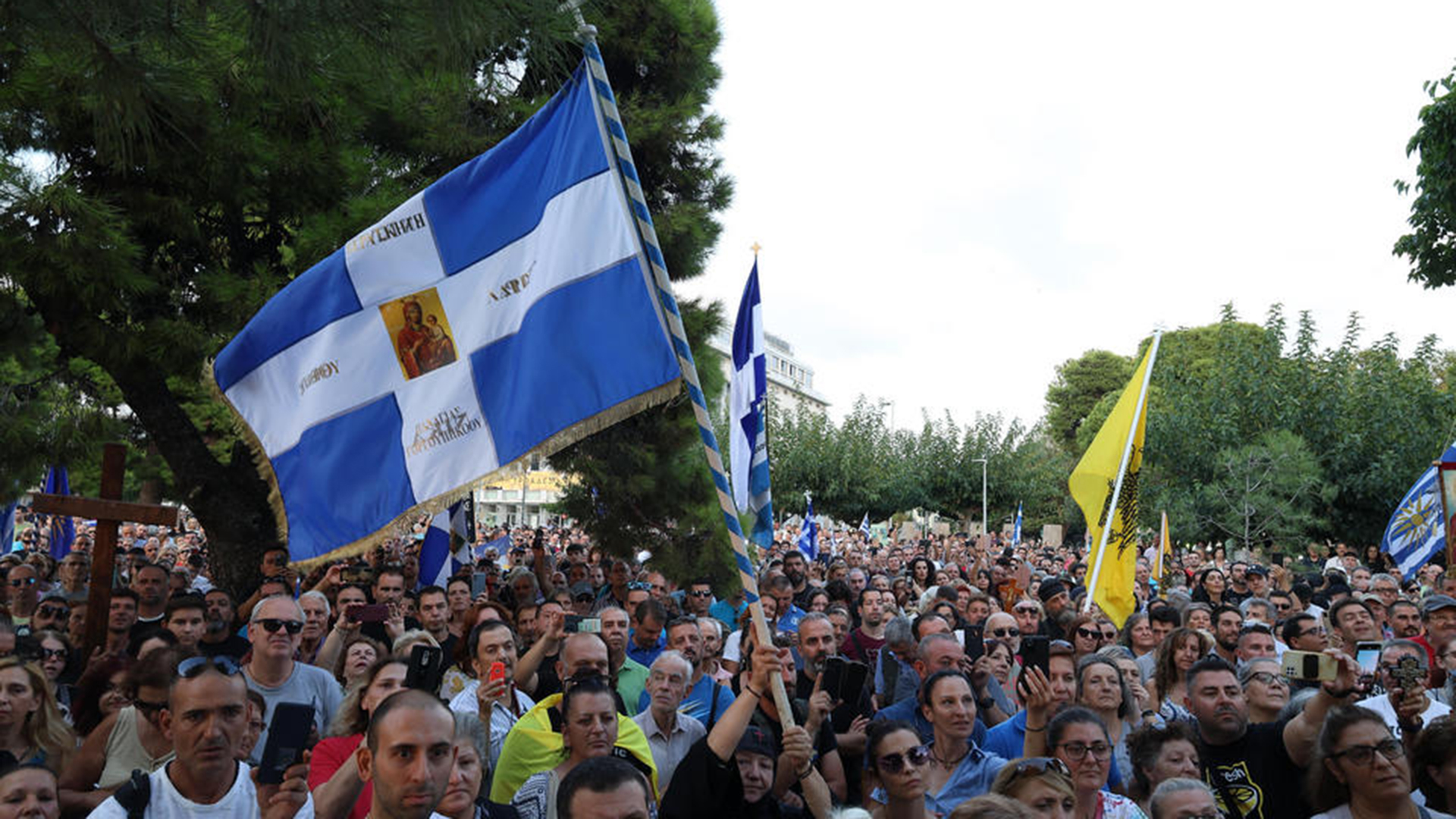 Ορισμένοι κρατούν ελληνικές σημαίες και θρησκευτικά λάβαρα.