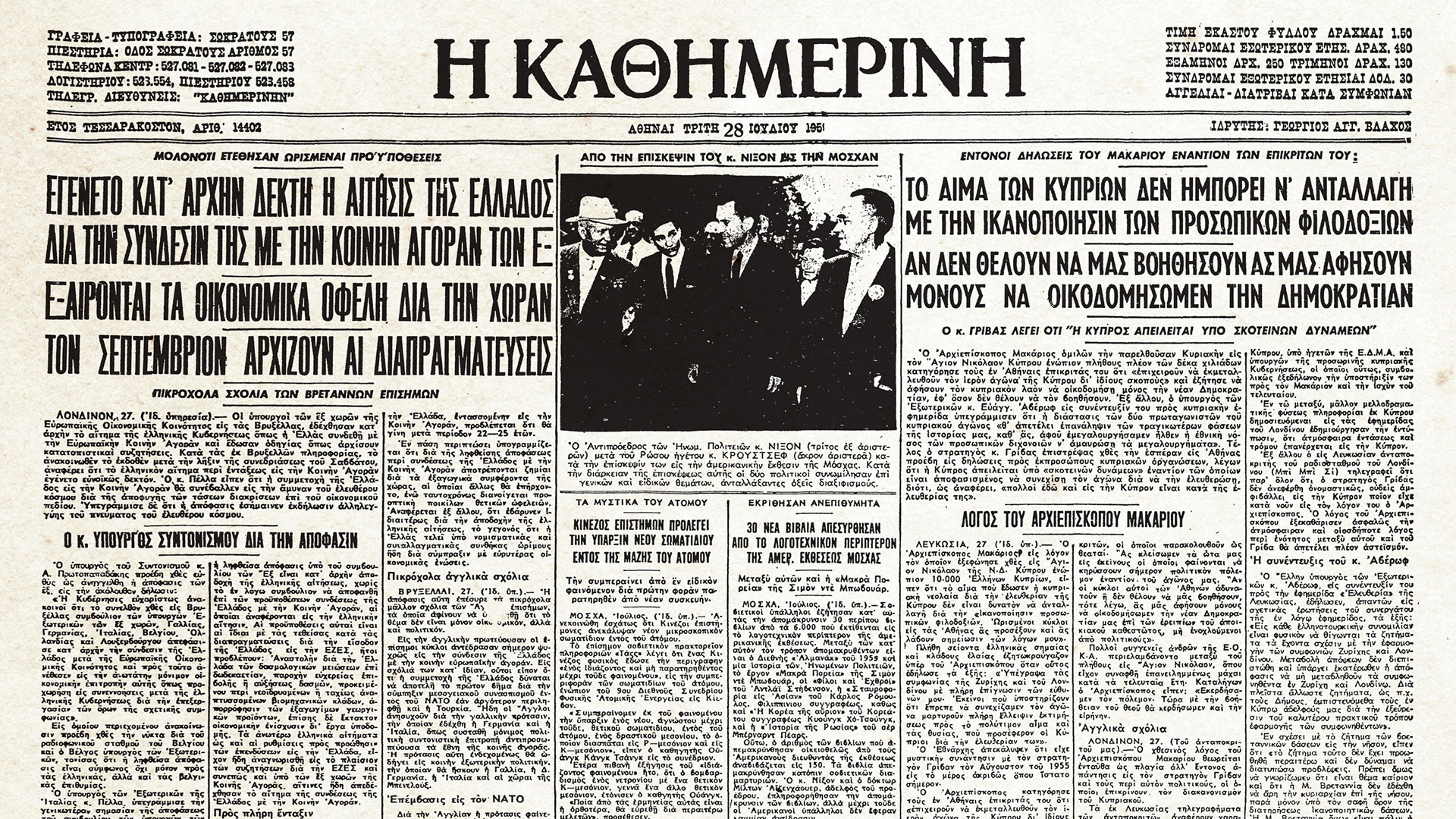 Σε συνέχεια των θεματικών αφιερωμάτων μέσα από το ιστορικό αρχείο της «Καθημερινής», αυτόν τον μήνα παρακολουθούμε την πορεία ένταξης της Ελλάδας στις ευρωπαϊκές κοινότητες. Οι προτεραιότητες της Ελλάδας στα τέλη της δεκαετίας του 1950 ήταν η άμυνα και η ασφάλεια, καθώς και η ευρωπαϊκή πολυμερής συνεργασία· μία επιλογή με ιστορικές καταβολές.
