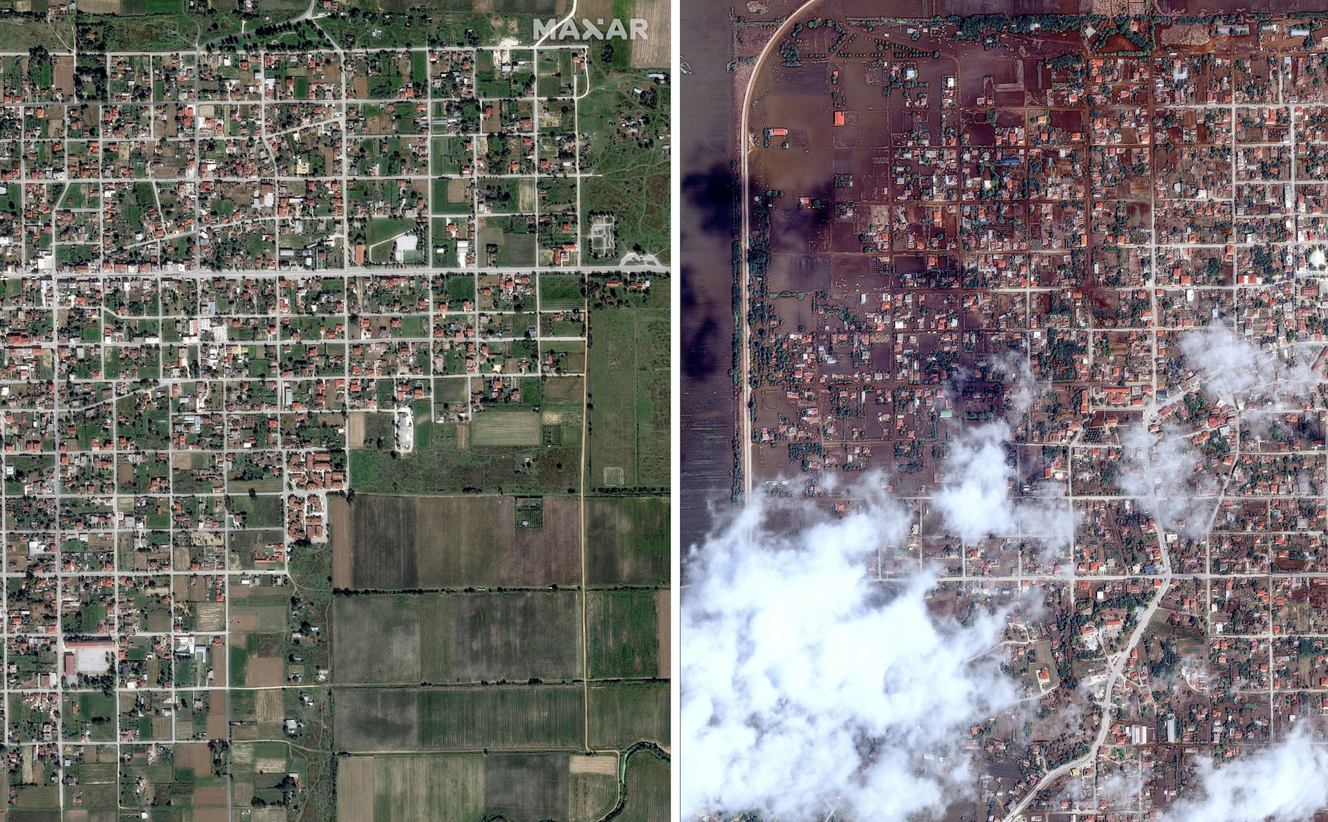 Το πριν και το μετά της καταστροφής, όπως αποτυπώνεται στις δορυφορικές λήψεις που έδωσε στη δημοσιότητα η εταιρεία Maxar Technologies, πραγματικά σοκάρει.
